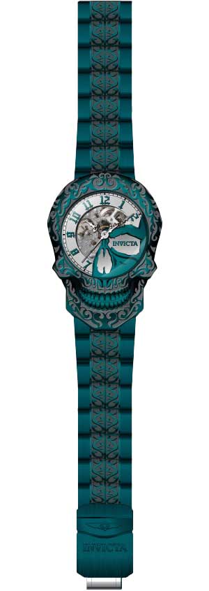 Необычный, вызывающий дизайн этих часов от Invicta станет настоящей находкой для ценителей уникальных аксессуаров. Скелетонизированные часы. В механизме 20 камней. Стальной корпус выполнен в форме черепа и украшен гравировкой. Метки в виде арабских цифр. Прозрачная задняя крышка. Заводная головка с защитой. Браслет с раскладывающейся застежкой украшен гравировкой. Застежка с системой блокировки. Производитель оставляет за собой право вносить изменения во внешний вид часов. Уточняйте при заказе, какой вариант в наличии в данный момент.