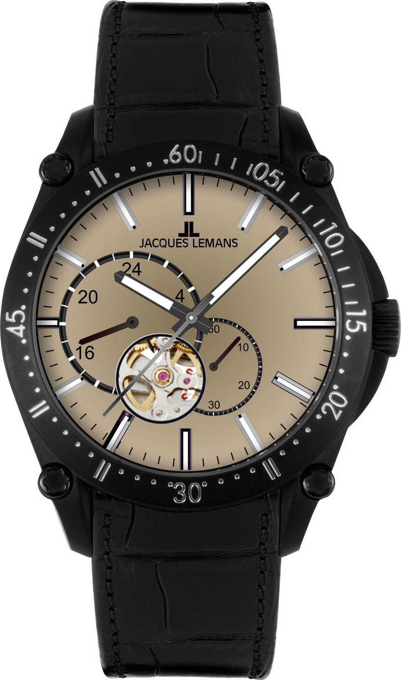Метки в виде штрихов. Стрелки и метки с люминесцентным покрытием, которое светится в темноте после непродолжительной зарядки на свету. На отдельные циферблаты вынесены индикатор 24-х часов и малая секундная стрелка. Сквозь прозрачное окошко можно наблюдать за работой механизма часов.