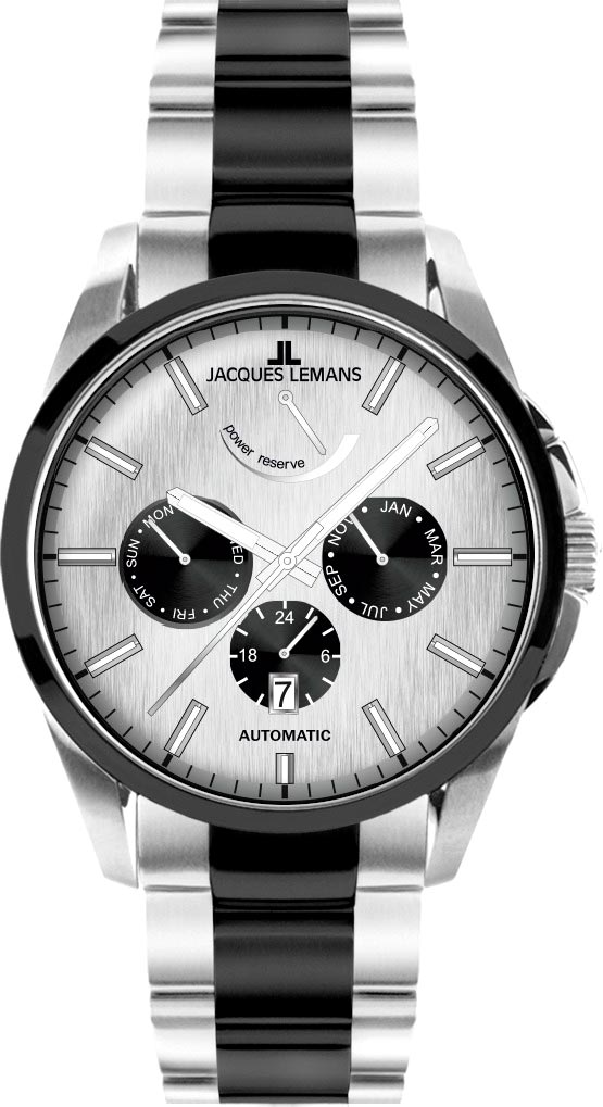 Мужские многофункциональные автоматические часы Derby. Круглый стальной корпус с матовой и полированной отделкой. Фактурный циферблат украшен фирменным логотипом Jacques Lemans. Накладные метки в виде штрихов. Широкие заостренные прямоугольные стрелки в стиле Baton.