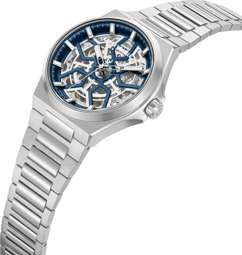 Скелетонизированные мужские наручные часы. В механизме 25 камней, частота 21600 полуколебаний в час. Запас хода 40 часов. Круглый стальной корпус. Метки в виде штрихов. Рифленая заводная головка с защитой. Прозрачная задняя крышка. Стальной браслет с раскладывающейся застежкой.