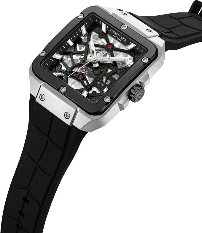Скелетонизированные мужские наручные часы. Квадратный стальной корпус. Безель украшен декоративными болтами. Циферблат с метками в виде штрихов. Рифленая заводная головка. Стальная задняя крышка с прозрачным окошком, защищенным минеральным стеклом. Силиконовый ремешок с классической застежкой.