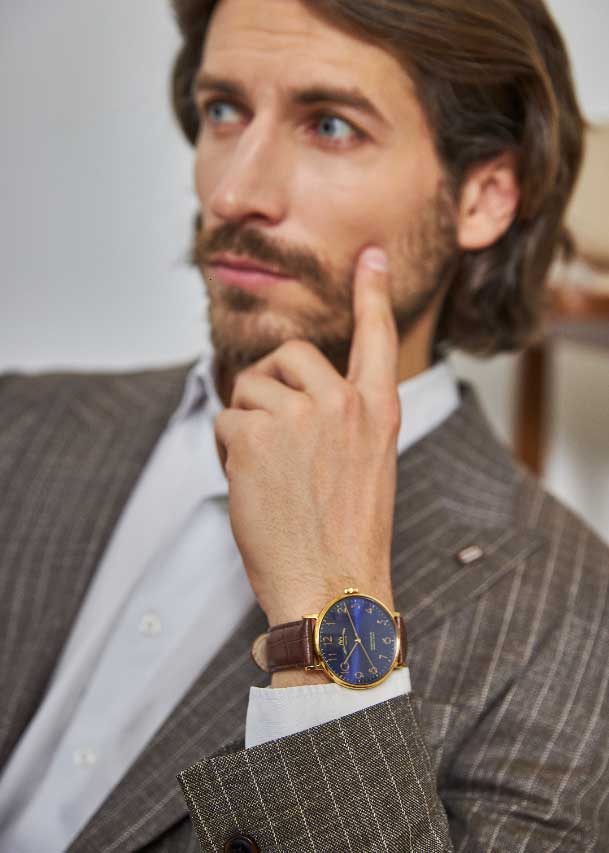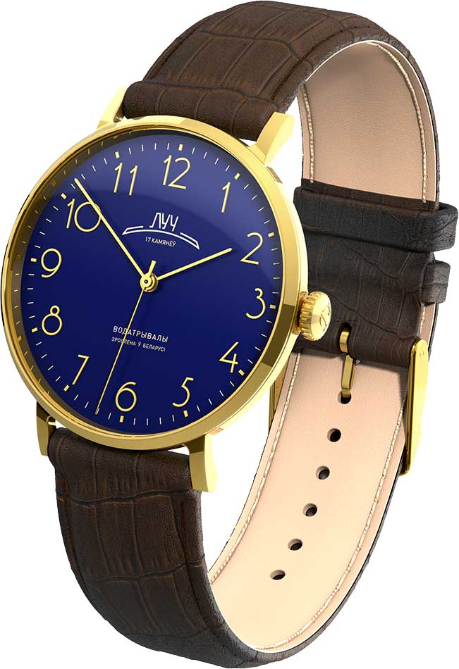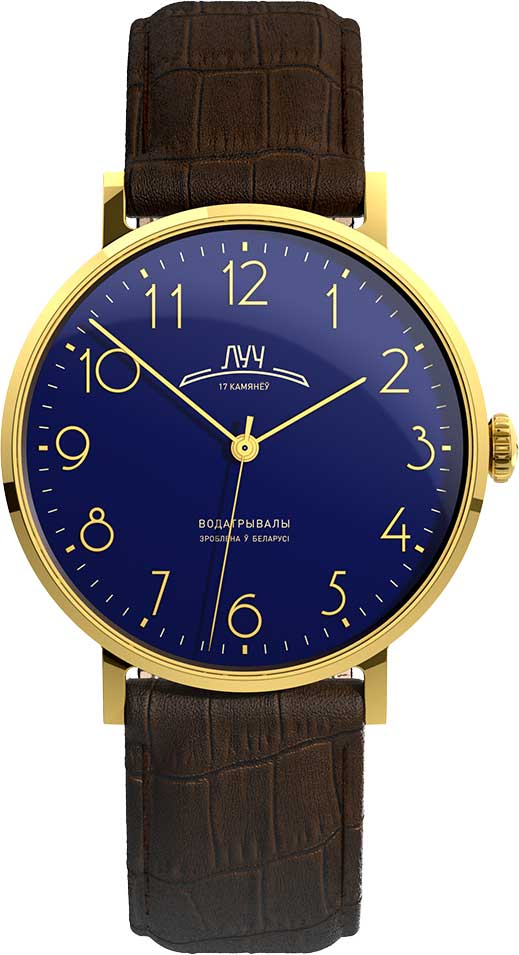 Мужские часы. Круглый стальной корпус. В механизме 17 камней, частота 19800 полуколебаний в час. Запас хода 38 часов. Противоударное устройство оси баланса. Циферблат с метками в виде арабских цифр. Прозрачная задняя крышка. Ремешок с классической застежкой.