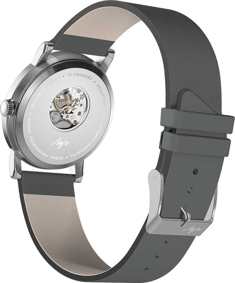 Simple 2.0. Унисекс часы. В механизме 15 камней. Запас хода 38 часов. Противоударное устройство оси баланса. Циферблат с метками в виде арабских цифр. Задняя крышка с прозрачным окошком. Ремешок с классической застежкой.