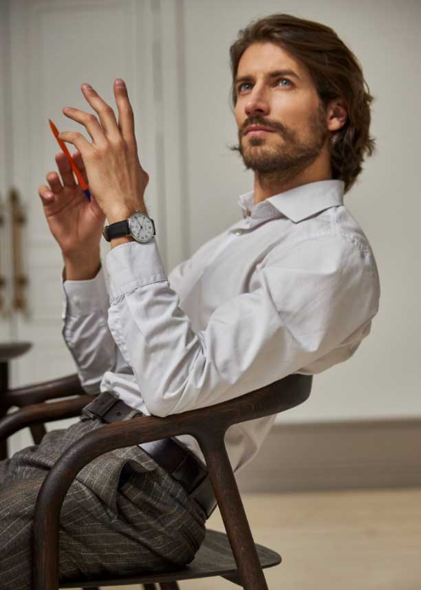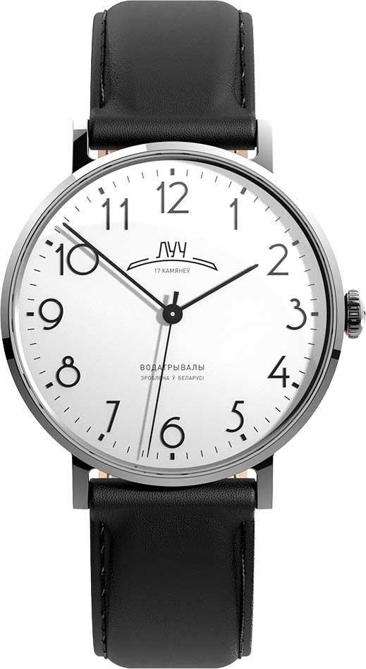 Мужские часы. Круглый стальной корпус. В механизме 17 камней, частота 19800 полуколебаний в час. Запас хода 38 часов. Противоударное устройство оси баланса. Циферблат с метками в виде арабских цифр. Прозрачная задняя крышка. Ремешок с классической застежкой.