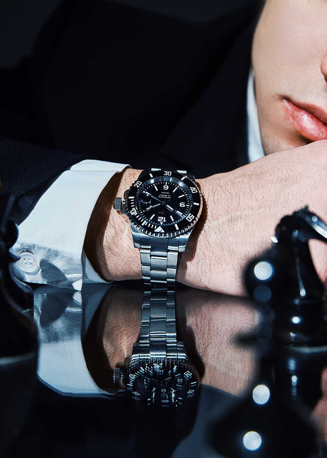 Циферблат выполнен по технологии Sunray (солнечные лучи) и защищен прочным сапфировым стеклом. Метки в виде штрихов и арабских цифр. Окошко даты с увеличительным стеклом. Заводная головка с защитой. Прозрачная задняя крышка. Браслет с раскладывающейся застежкой.