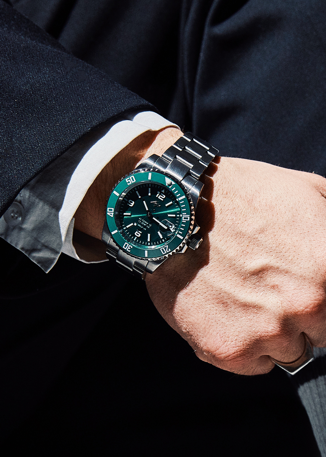 Циферблат выполнен по технологии Sunray (солнечные лучи) и защищен прочным сапфировым стеклом. Метки в виде штрихов и арабских цифр. Окошко даты с увеличительным стеклом. Заводная головка с защитой. Прозрачная задняя крышка. Браслет с раскладывающейся застежкой.