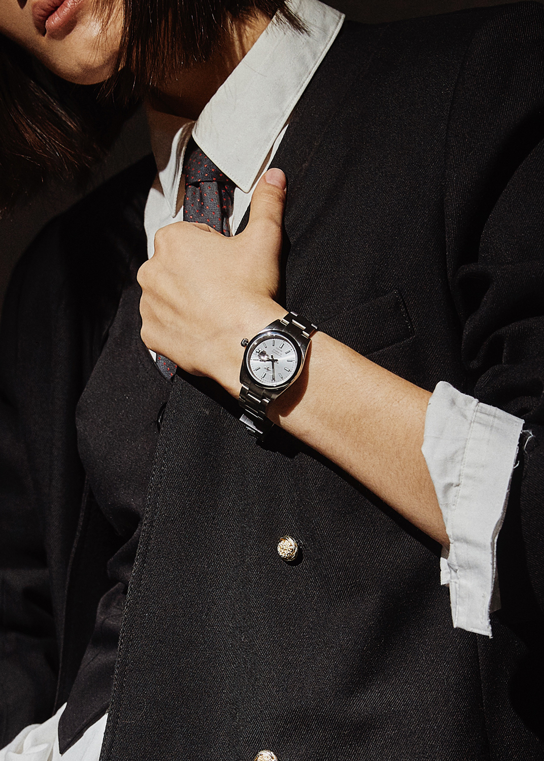 Циферблат выполнен по технологии Sunray (солнечные лучи) и защищен прочным сапфировым стеклом. Метки в виде штрихов. Окошко даты с увеличительным стеклом. Прозрачная задняя крышка. Браслет с раскладывающейся застежкой.