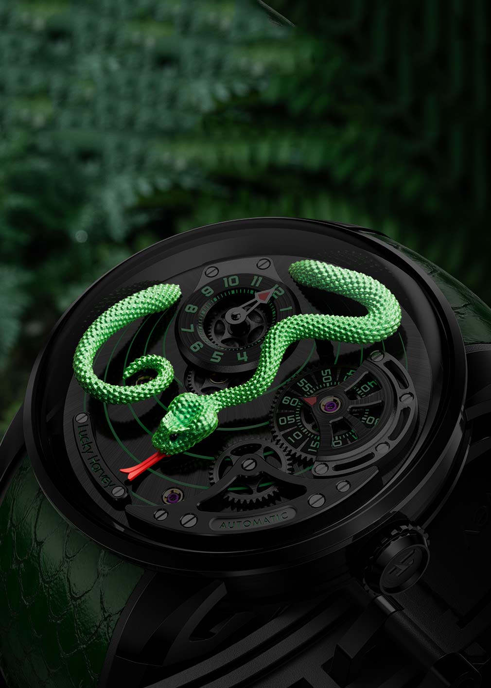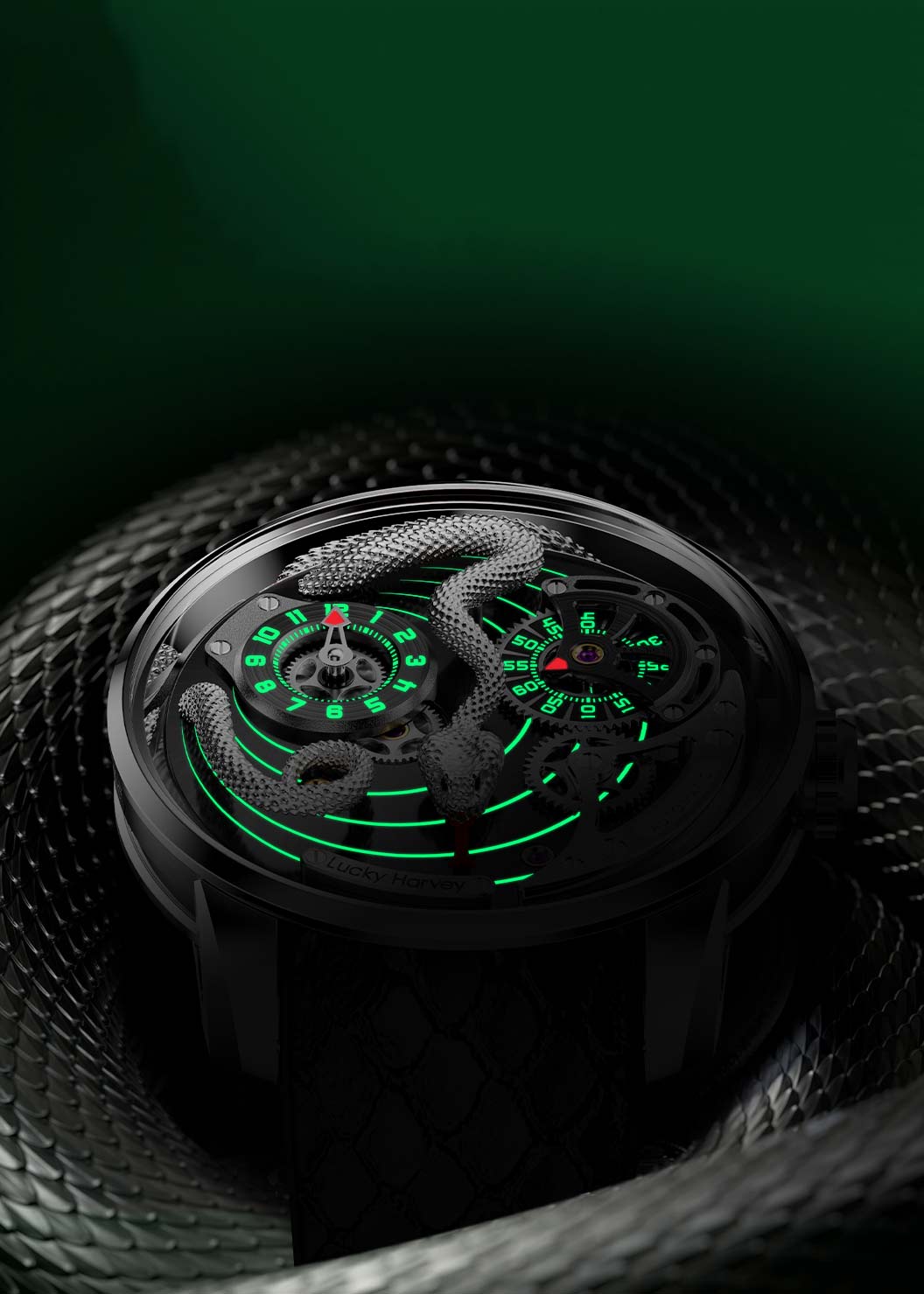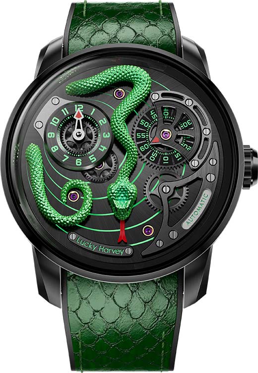 Циферблат дополнен объемной, детально проработанной змеей, периодически высовывающей язык. На вращающихся дисках — указатели часов и минут. Метки в виде арабских цифр и отдельные элементы на циферблате с люминесцентным покрытием, которое светится в темноте после непродолжительной зарядки на свету.