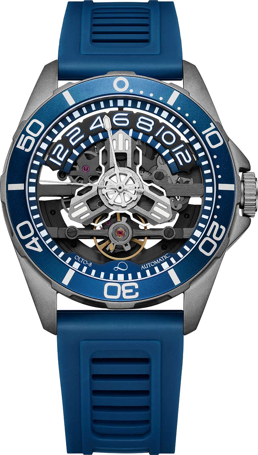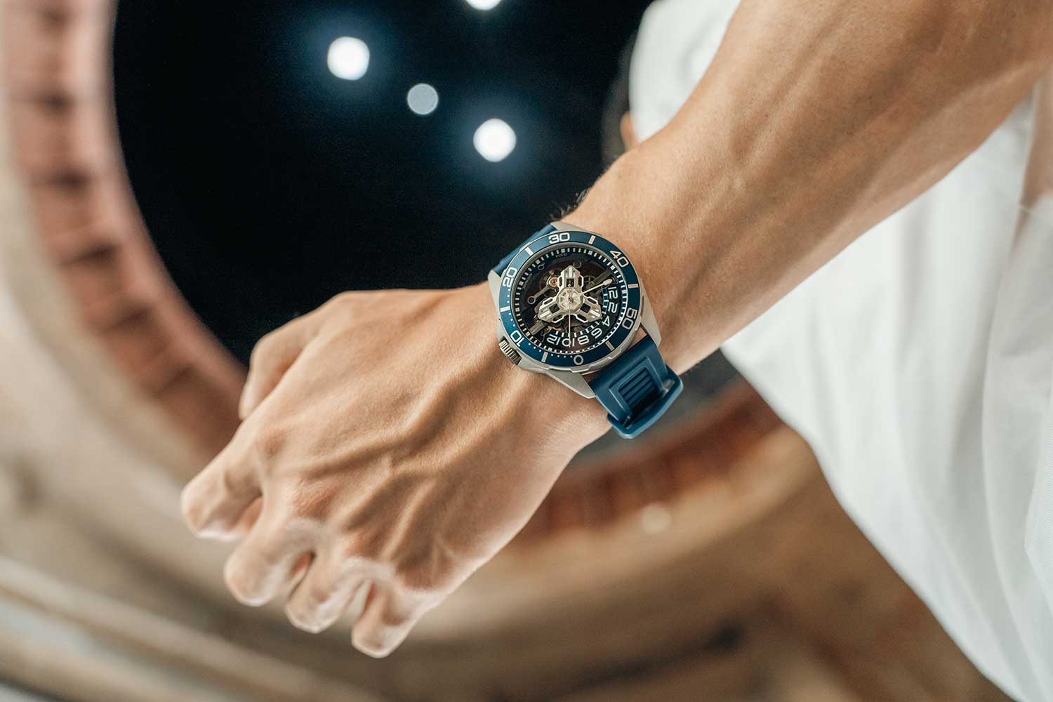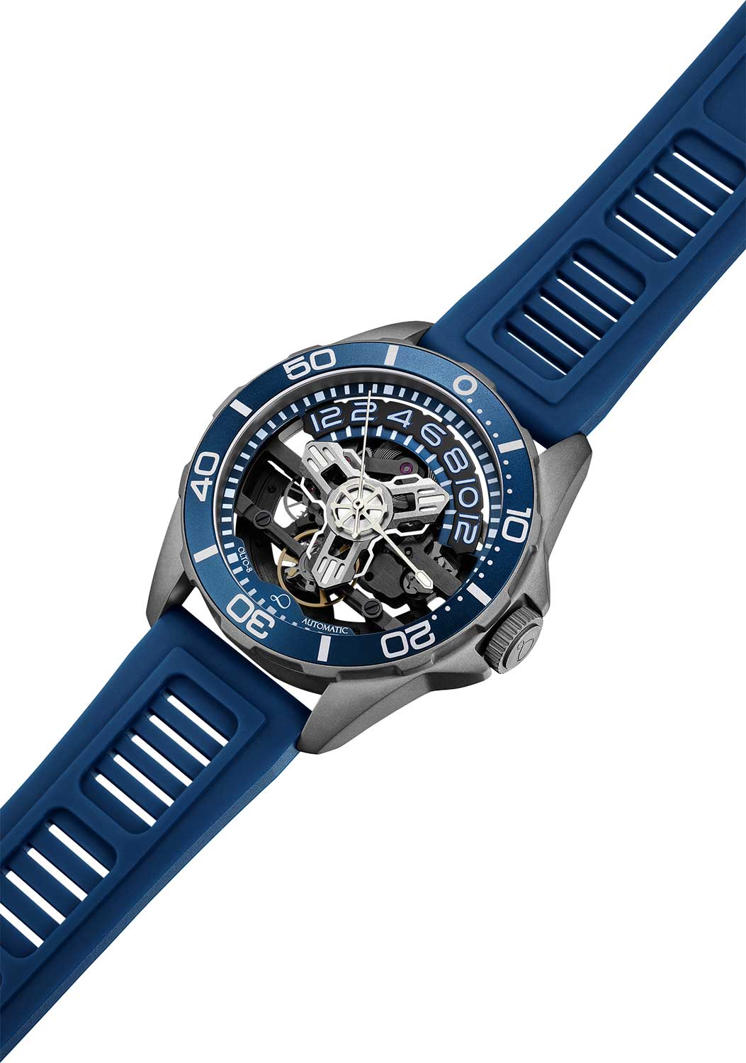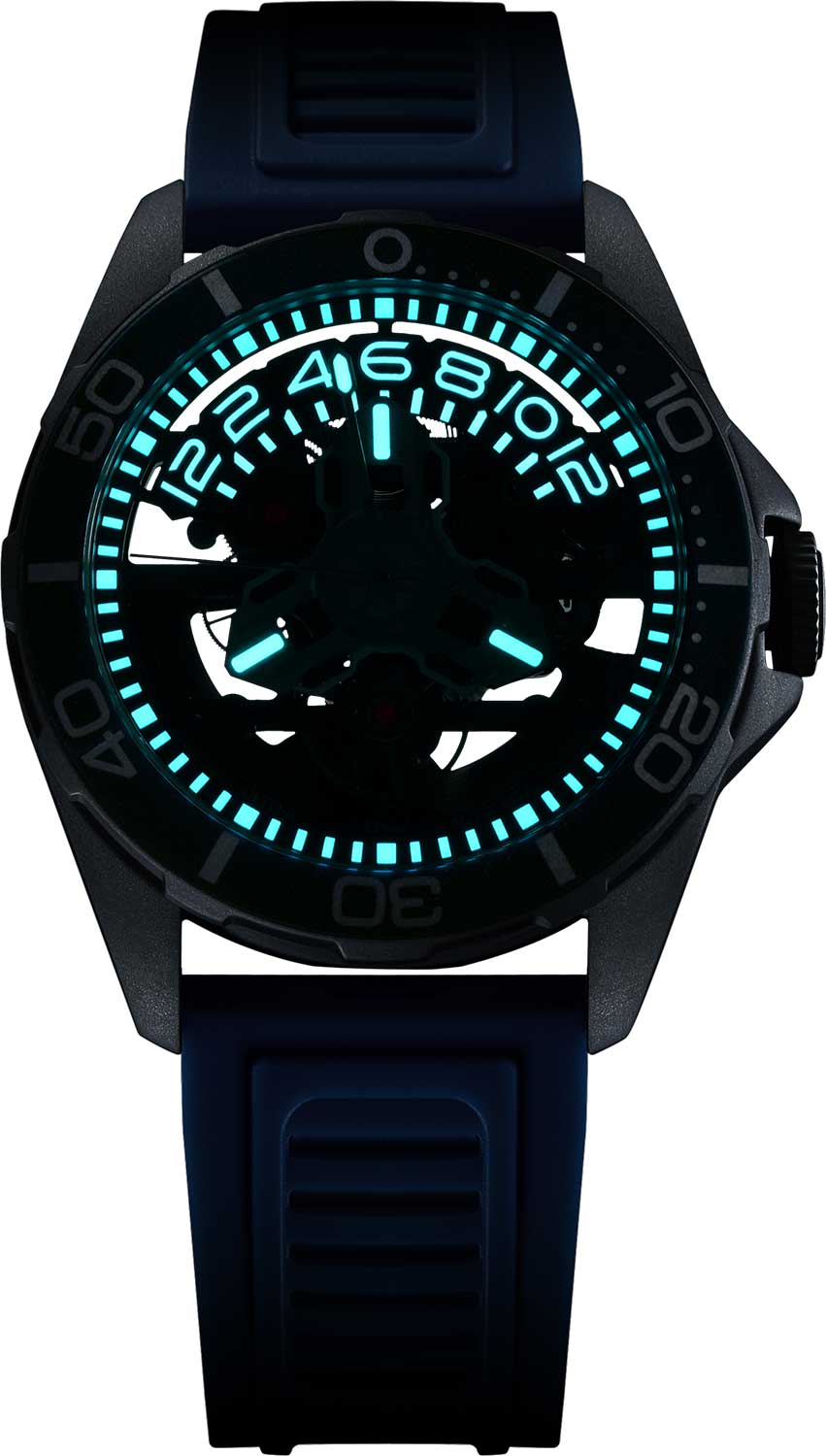 Tide X.Скелетонизированные часы. Модель вдохновлена таинственными глубинами океана. В механизме 24 камня,частота 28800 полуколебаний в час. Запас хода 40 часов. Возможность ручного завода. Часы отображаются в верхней части циферблата трехлучевой стрелкой. Минутная стрелка украшена корабельным штурвалом. Безель с алюминиевой вставкой вращается в одном направлении. Завинчивающаяся заводная головка с защитой. Завинчивающаяся прозрачная задняя крышка. Ремешок с классической застежкой и системой быстрой замены.