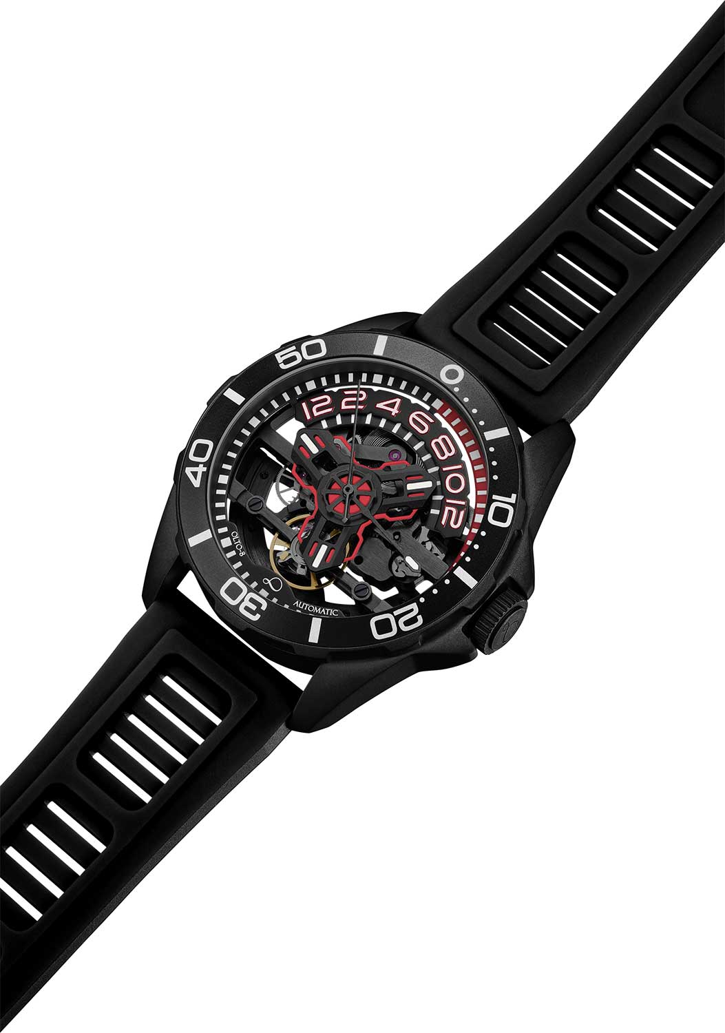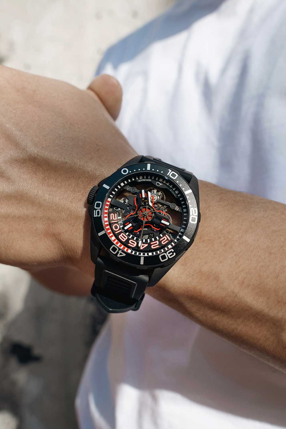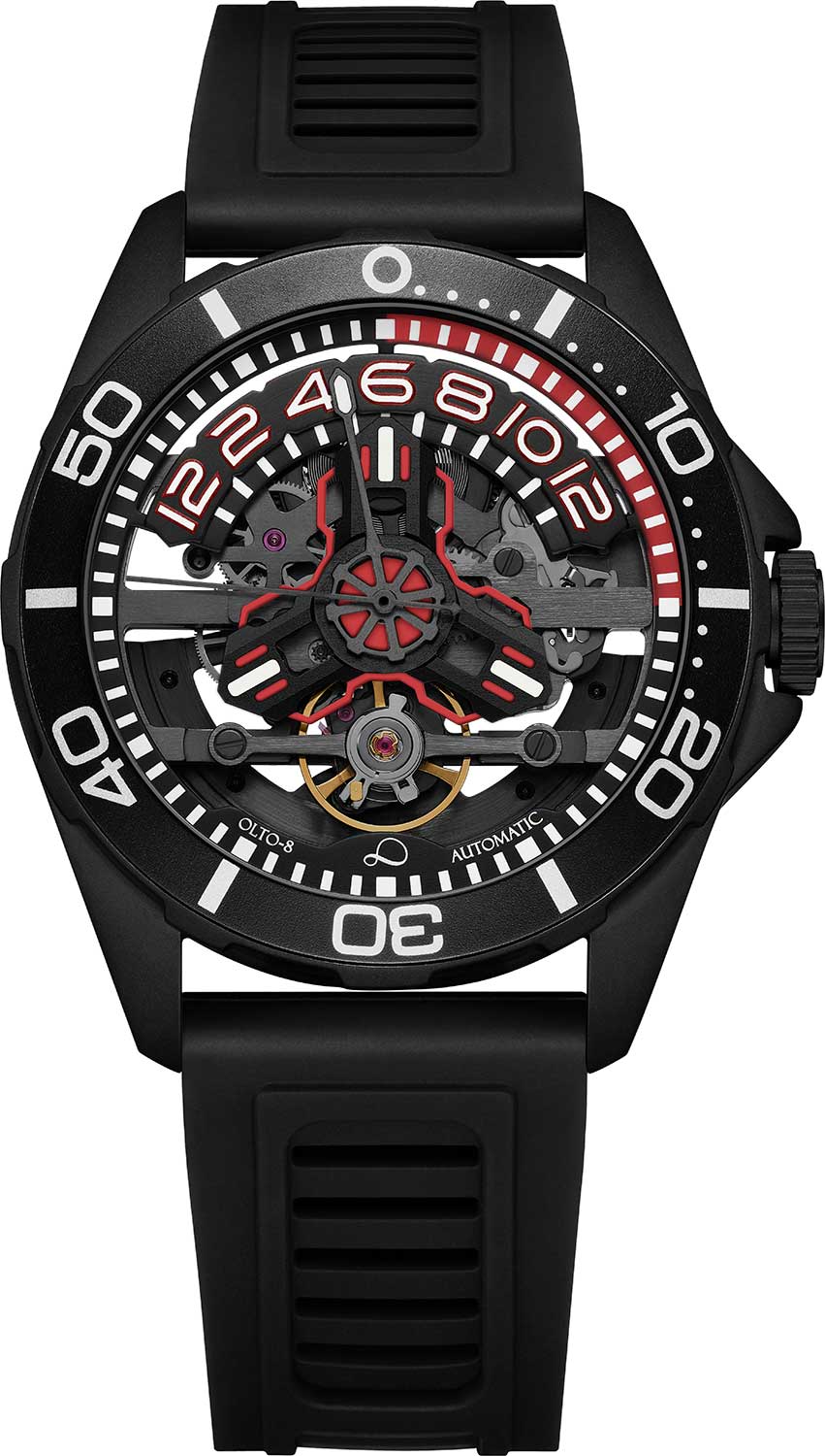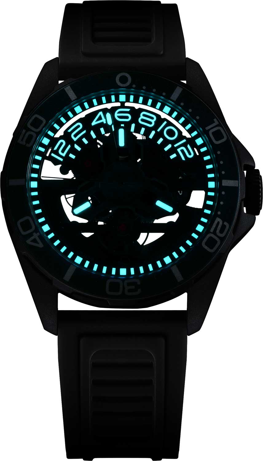 Tide X.Скелетонизированные часы. Красные элементы на часах символизируют опасность глубоководных исследований. В механизме 24 камня,частота 28800 полуколебаний в час. Запас хода 40 часов. Возможность ручного завода. Часы отображаются в верхней части циферблата трехлучевой стрелкой. Минутная стрелка украшена корабельным штурвалом. Безель с алюминиевой вставкой вращается в одном направлении. Завинчивающаяся заводная головка с защитой. Завинчивающаяся прозрачная задняя крышка. Ремешок с классической застежкой и системой быстрой замены.