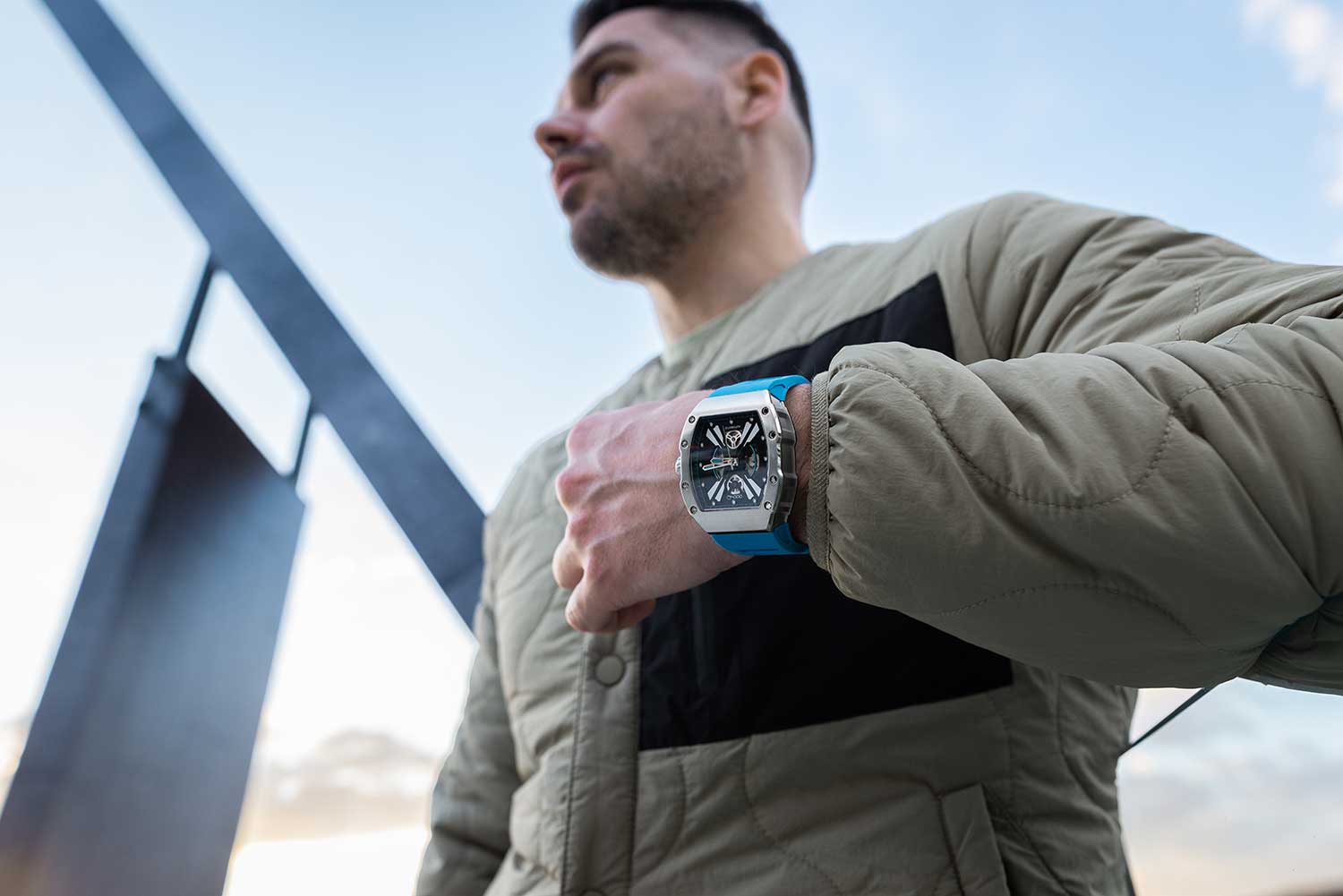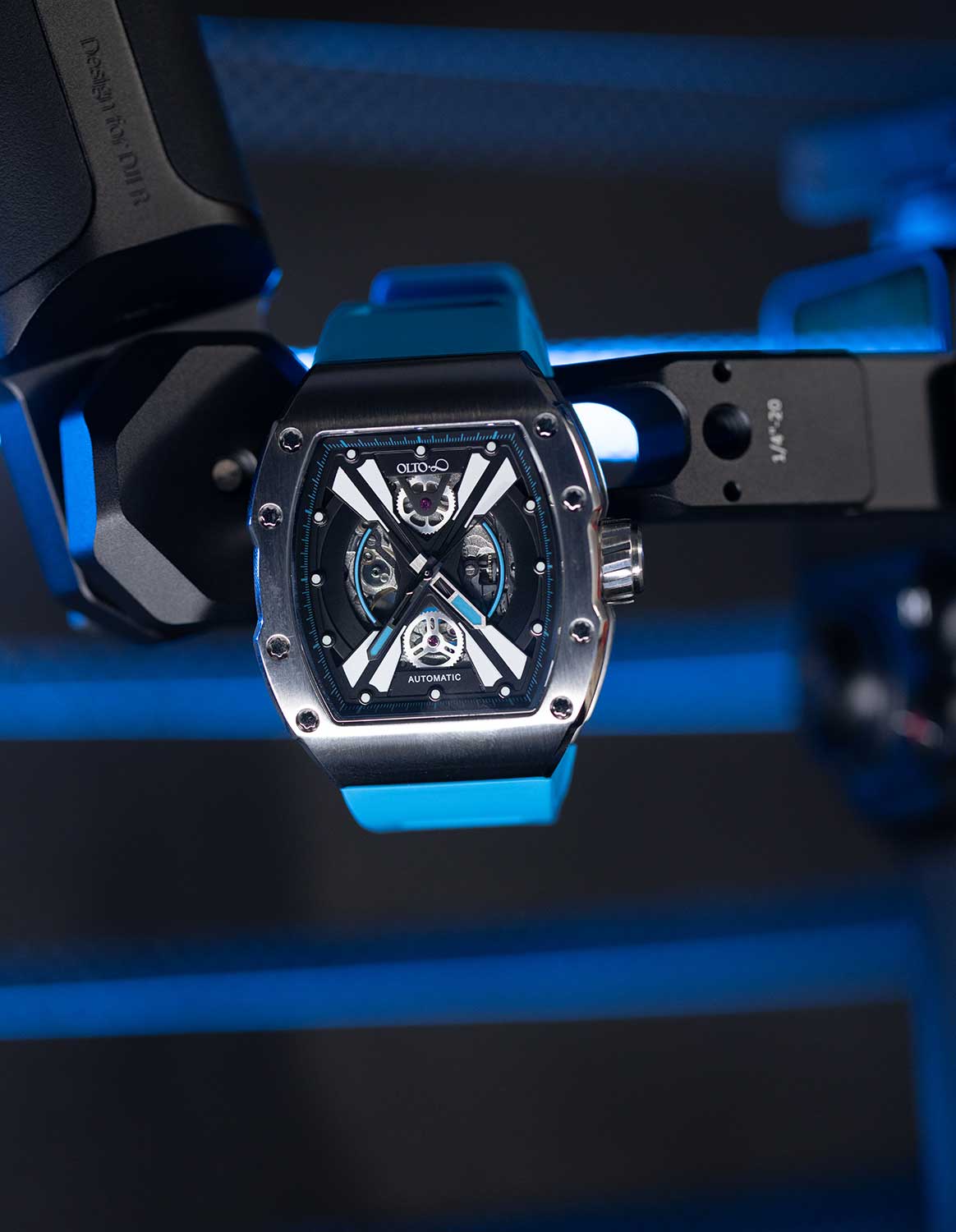 Explore X.Скелетонизированные наручные часы, дизайн которых вдохновлен космическим кораблем. В механизме 21 камень,частота 21600 полуколебаний в час. Запас хода 42 часа. Функция stop-second. Возможность ручного завода. Циферблат с метками в виде точек защищен прочным сапфировым стеклом. Стрелки и метки с люминесцентным