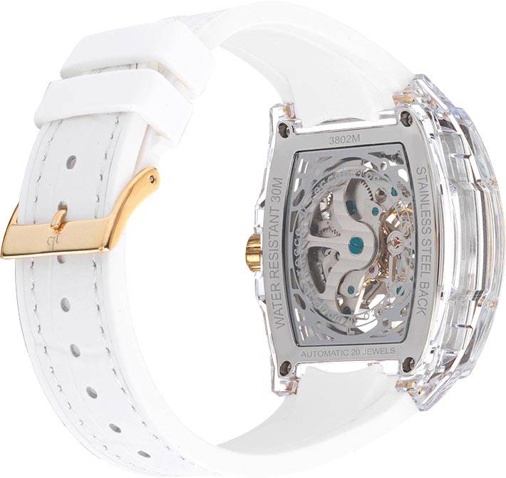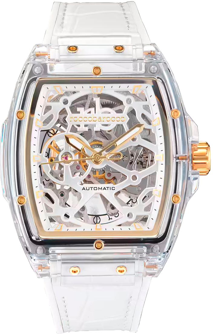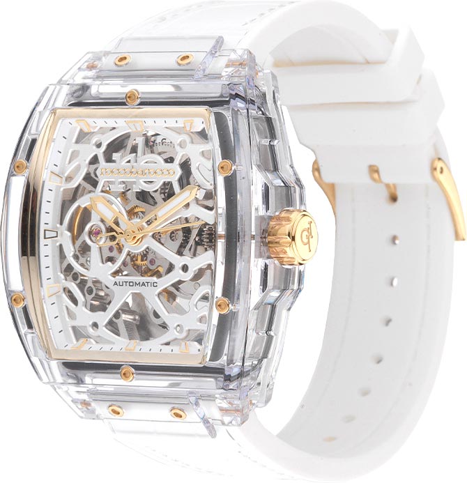 Автоматические скелетонизированные наручные унисекс часы. Пластиковый корпус в форме бочки. Безель с декоративными винтами. В механизме 20 камней. Прозрачный циферблат с небольшими метками в виде штрихов. Мечевидные стрелки в стиле Sword. Метки и стрелки с люминесцентным покрытием, которое светится в темноте после непродолжительной зарядки на свету. Рифленая заводная головка с защитой. Прозрачная задняя крышка. Удобный каучуковый ремешок с кожаной вставкой. Классическая застежка.