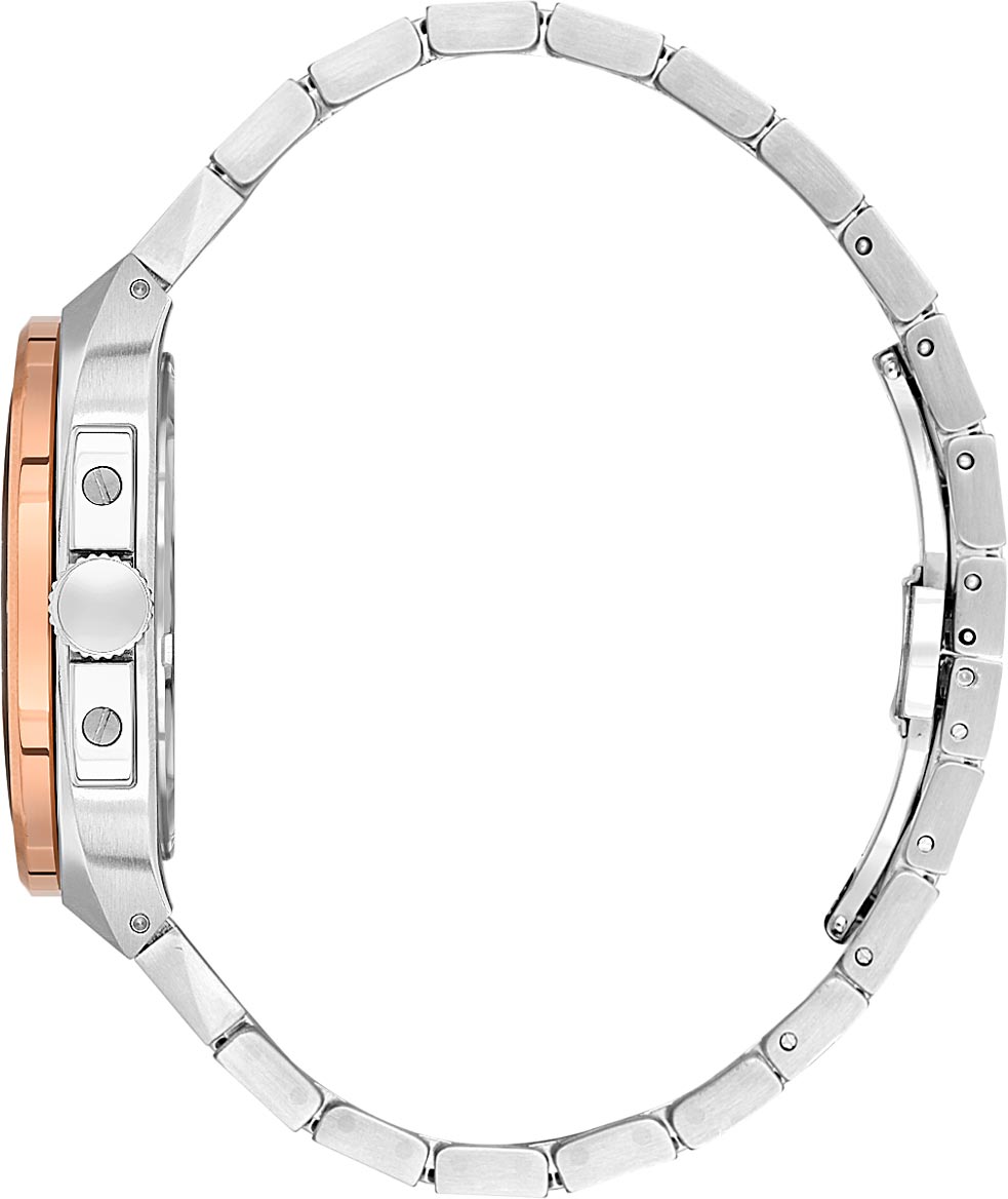Практичные часы с круглым корпусом. Приоткрытый взору механизм и строгий дизайн подчеркивают их сдержанный характер. Автоматические мужские наручные часы. Круглый стальной корпус с матовой и полированной отделкой. Сквозь прозрачное окошко на циферблате можно наблюдать за работой механизма часов. Фактурный циферблат украшен фирменным логотипом. Накладные метки в виде штрихов. Прямоугольные заостренные стрелки в стиле Baton с люминесцентным покрытием, которое светится в темноте после непродолжительной зарядки на свету. Рифленая заводная головка с защитой. Надежный стальной браслет с матовой и полированной отделкой. Раскладывающаяся застежка.