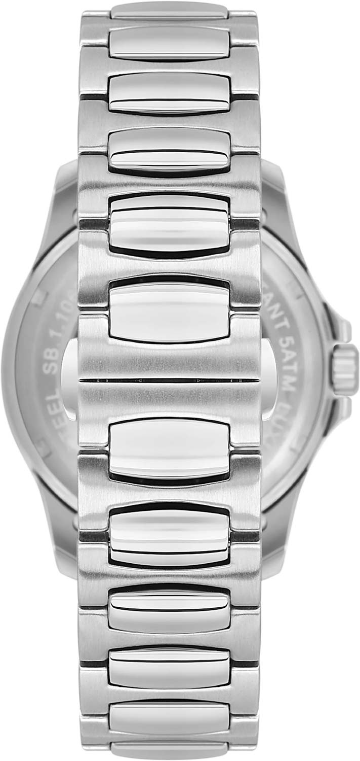 Luxury. Автоматические мужские часы. В механизме 21 камень, частота 21600 полуколебаний в час. Запас хода 42 часа. Стальной корпус. Сквозь окошко на циферблате можно наблюдать за работой механизма часов. Накладные метки в виде штрихов. Метки и стрелки с люминесцентным покрытием, которое светится в темноте после непродолжительной зарядки на свету. Рифленая заводная головка с защитой. Стальной браслет с матовой и полированной отделкой. Раскладывающаяся застежка.