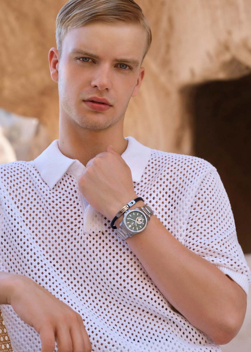 Luxury. Автоматические мужские часы. В механизме 21 камень, частота 21600 полуколебаний в час. Запас хода 42 часа. Стальной корпус. Сквозь окошко на циферблате можно наблюдать за работой механизма часов. Накладные метки в виде штрихов. Метки и стрелки с люминесцентным покрытием, которое светится в темноте после непродолжительной зарядки на свету. Рифленая заводная головка с защитой. Стальной браслет с матовой и полированной отделкой. Раскладывающаяся застежка.