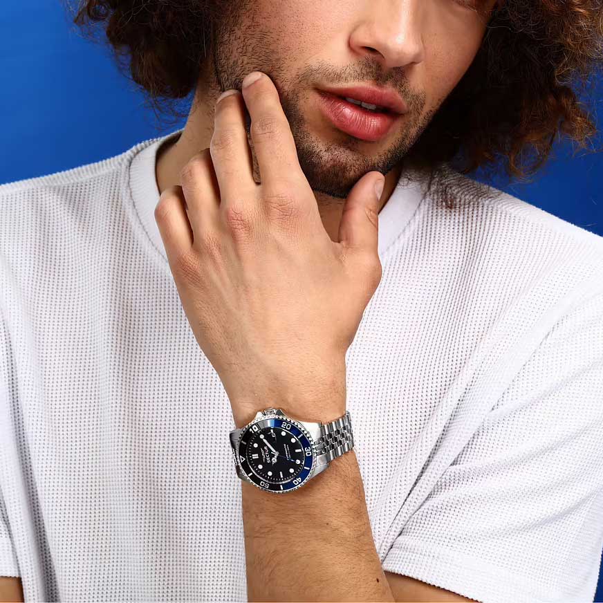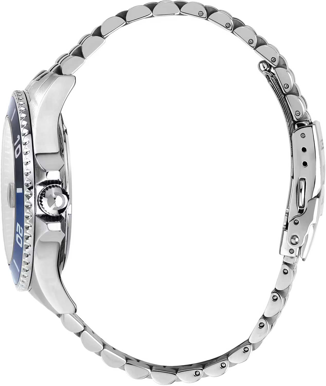 Мужские механические часы. В механизме 21 камень, частота 21600 полуколебаний в час. Запас хода 42 часа. Функция stop-second. Возможность ручного завода. Циферблат с метками в виде точек и штрихов. Окошко даты с увеличительным стеклом находится в положении 3 часа. Безель с алюминиевой вставкой вращается в одном направлении. Заводная головка с защитой. Завинчивающаяся задняя крышка. Браслет с раскладывающейся застежкой. Застежка с системой блокировки.