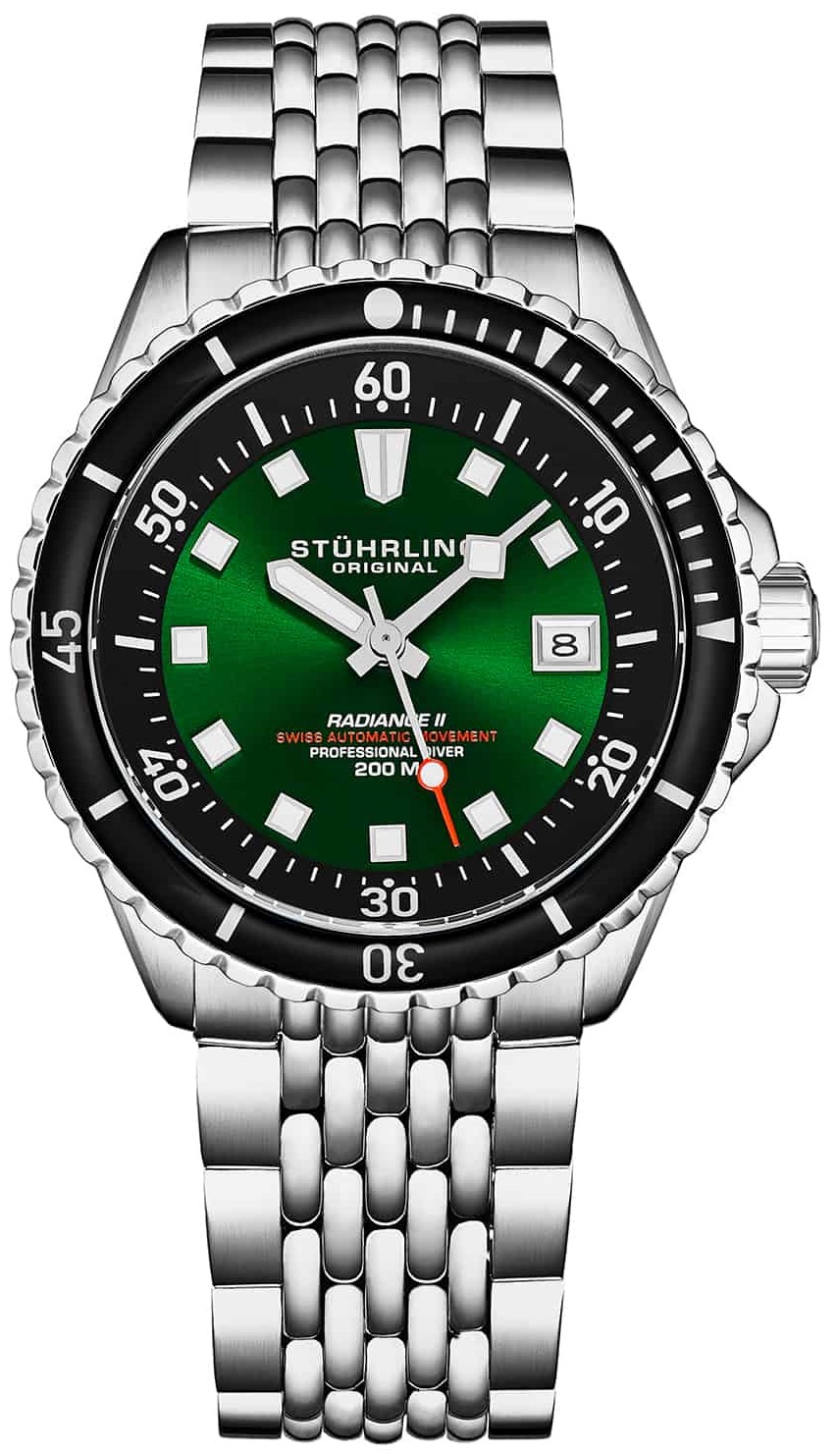 Стильные дайверские часы в спортивном дизайне со сменным ремешком, привлекут внимание молодых людей с уверенной жизненной позицией. Мужские механические дайверские часы Radiance 2. Накладные метки в виде точек. Окошко даты. Рифленая заводная головка. Браслет с раскладывающейся застежкой.
