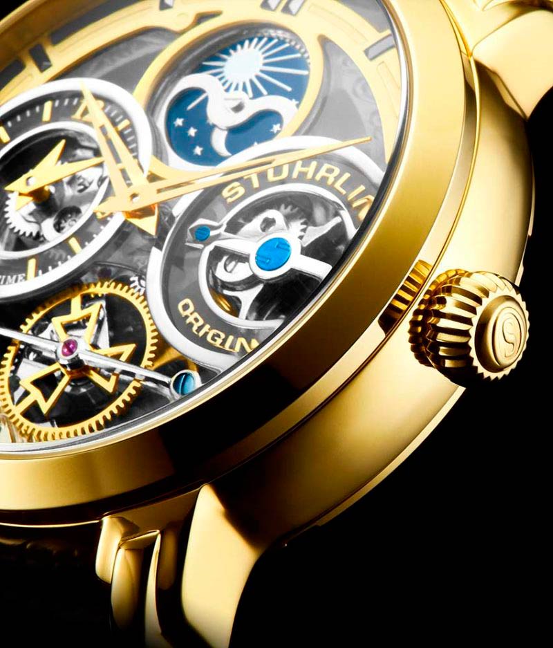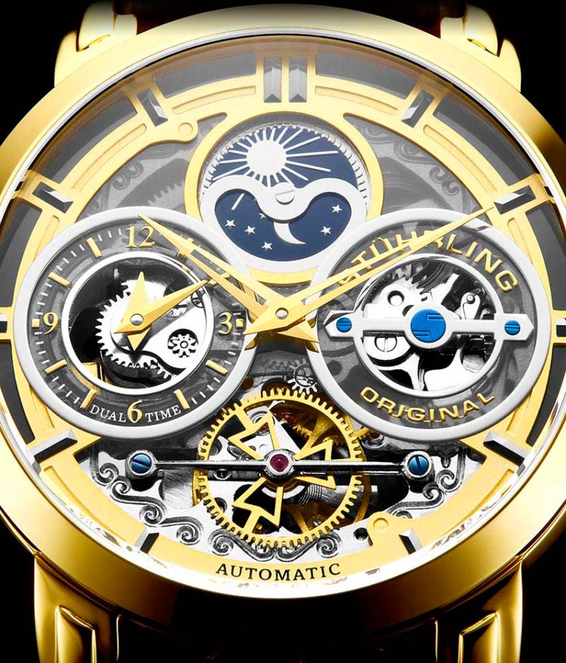 Массивный корпус этих стильных часов прекрасно дополнит образ успешного мужчины. Luciano. Скелетонизированные часы. Второй часовой пояс. В механизме 22 камня. Запас хода 36 часов. Индикатор день/ночь. Накладные индексы. Завинчивающаяся задняя крышка со стеклом Krysterna. Заводная головка украшена логотипом Stuhrling. Браслет с раскладывающейся застежкой.