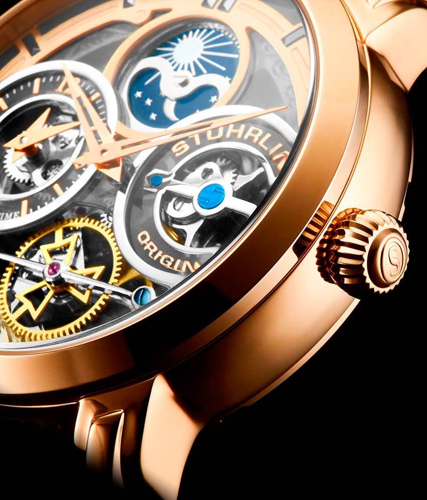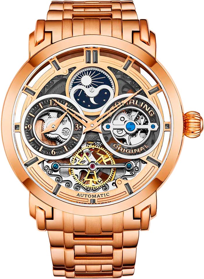 Массивный корпус этих стильных часов прекрасно дополнит образ успешного мужчины. Luciano. Скелетонизированные часы. Второй часовой пояс. В механизме 22 камня. Запас хода 36 часов. Индикатор день/ночь. Накладные индексы. Завинчивающаяся задняя крышка со стеклом Krysterna. Заводная головка украшена логотипом Stuhrling. Браслет с раскладывающейся застежкой.