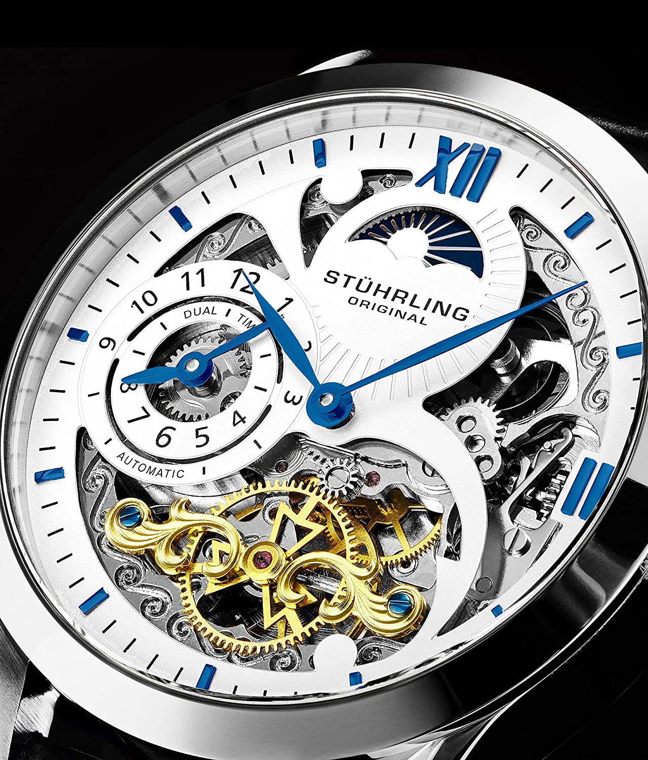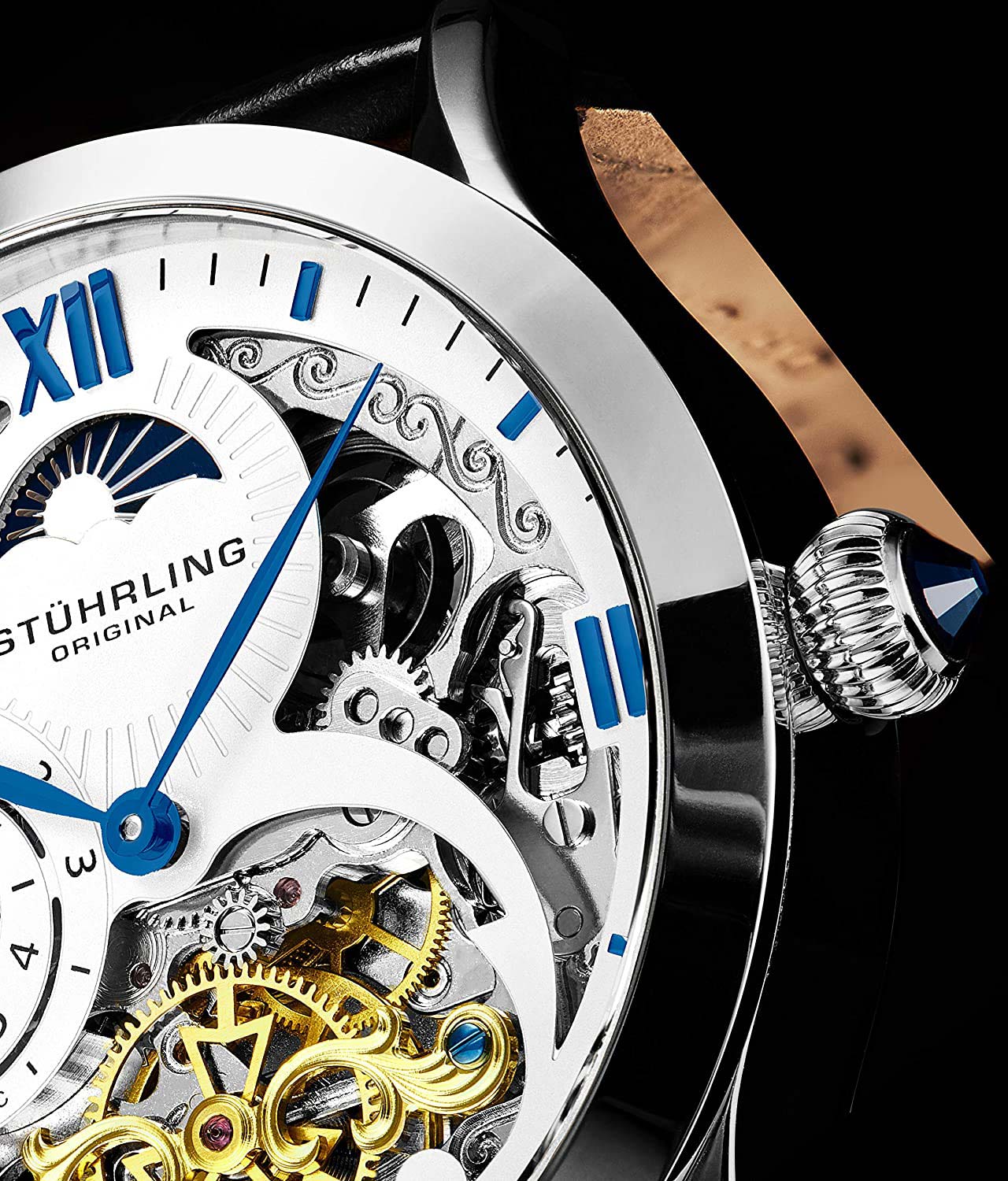 Наслаждайтесь каждой минутой времени с этими стильными мужскими часами. Special Reserve. Скелетонизированные часы. В механизме 22 камня. Второй часовой пояс. Индикатор день/ночь. Накладные метки в виде штрихов и арабских цифр. Завинчивающаяся задняя крышка со стеклом Krysterna. Заводная головка украшена камнем в форме кабошона. Ремешок с классической застежкой.