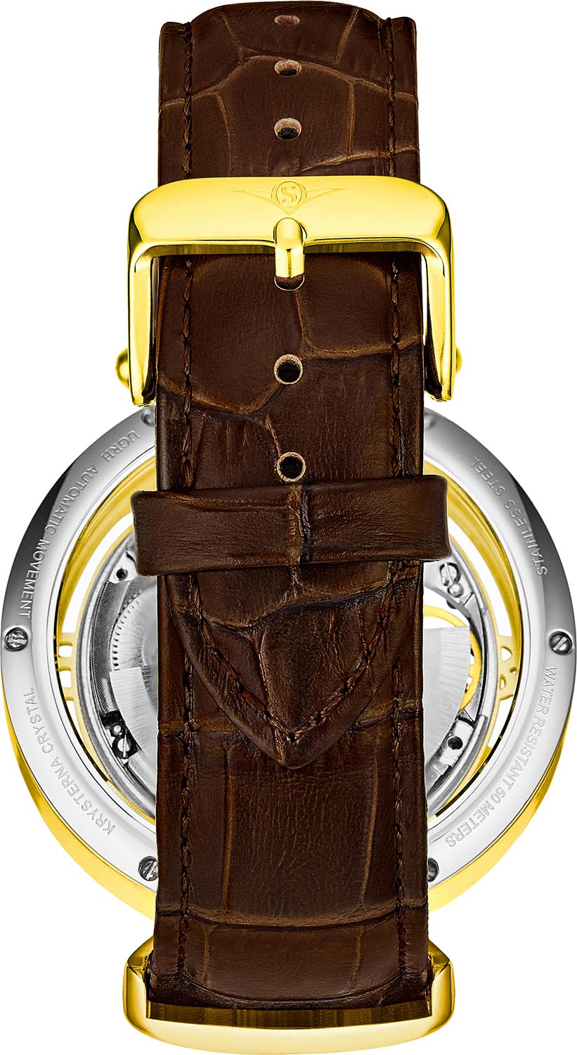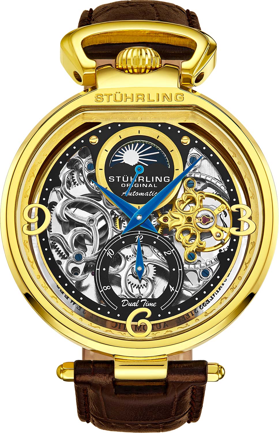 Превосходные механические часы от Stuhrling - только стиль, качество и точность! Automatic. Скелетонизированные часы. Второй часовой пояс. Индикатор день/ночь. Завинчивающаяся задняя крышка со стеклом Krysterna. Рифленая заводная головка с защитой находится в положении 12 часов. Ремешок с классической застежкой.