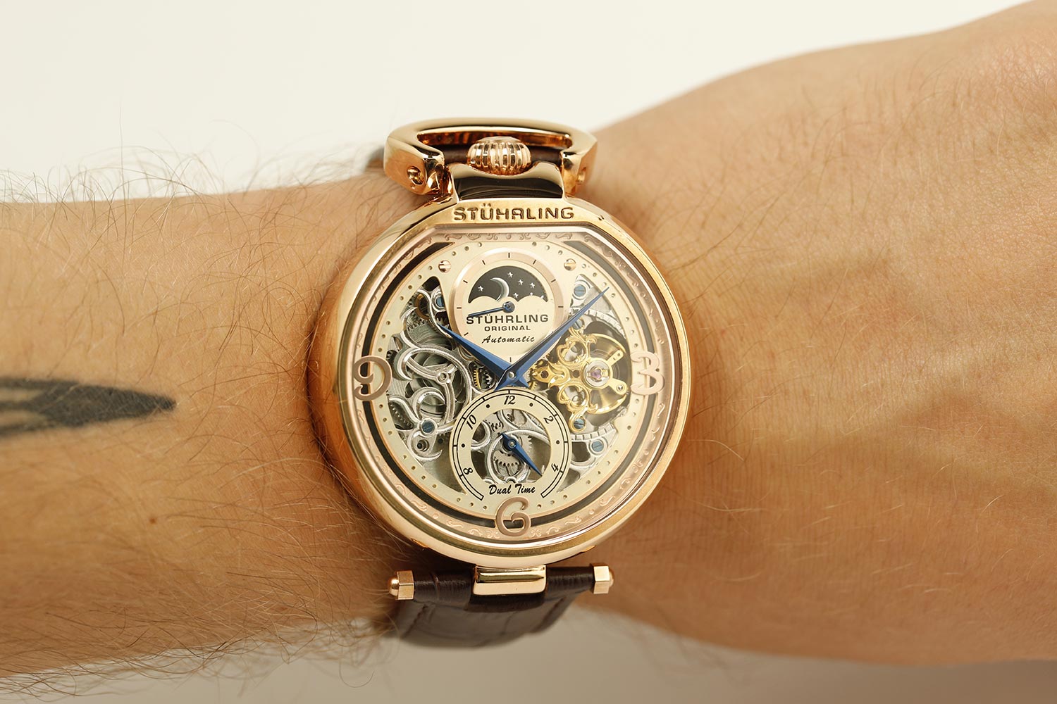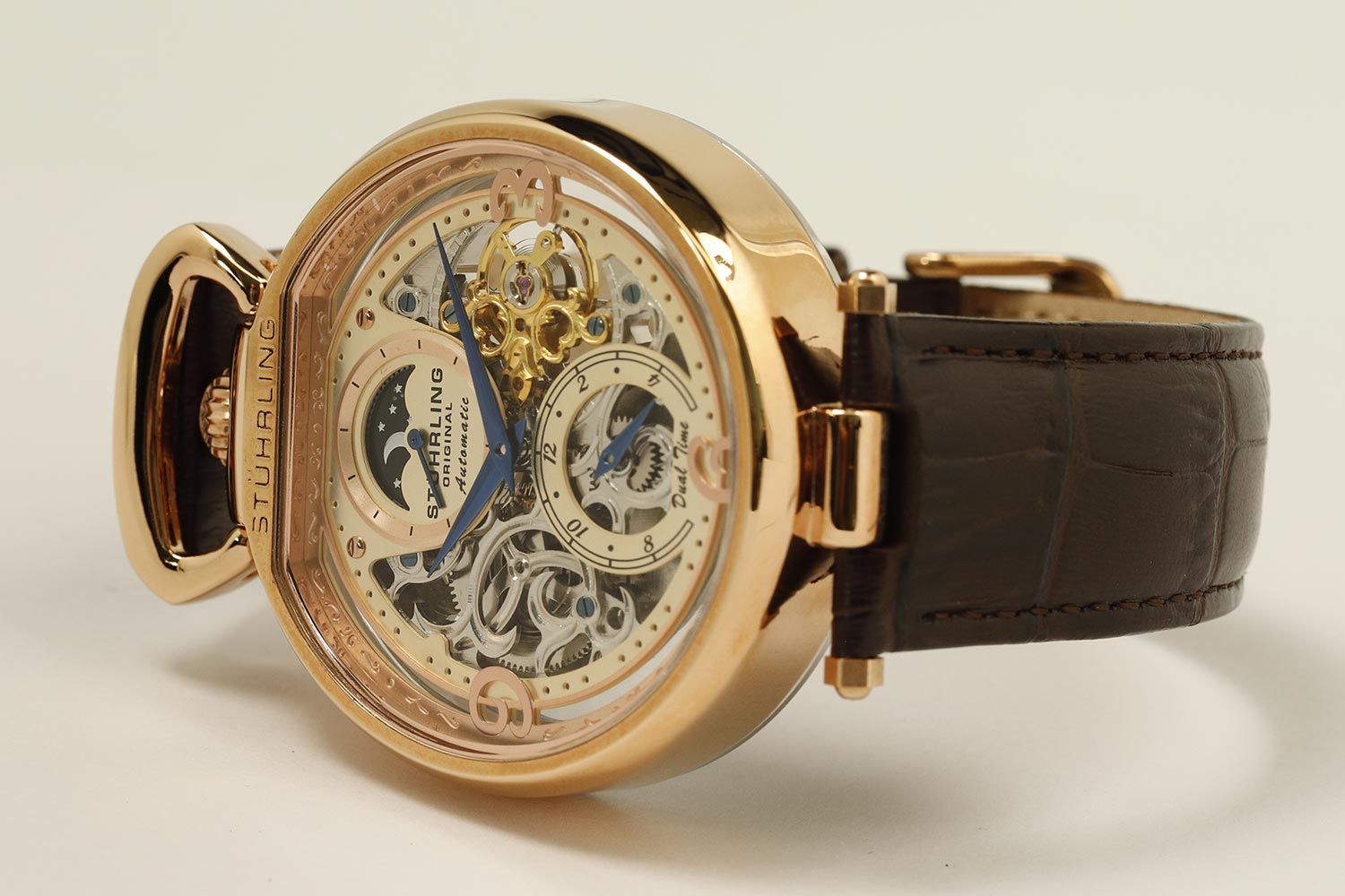 Превосходные механические часы от Stuhrling - только стиль, качество и точность! Automatic. Скелетонизированные часы. Второй часовой пояс. Индикатор день/ночь. Завинчивающаяся задняя крышка со стеклом Krysterna. Рифленая заводная головка с защитой находится в положении 12 часов. Ремешок с классической застежкой.