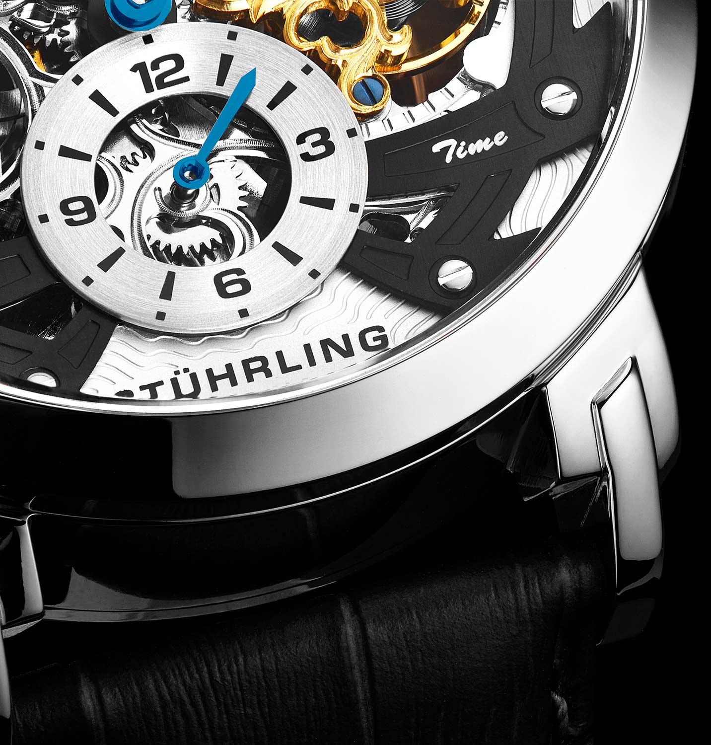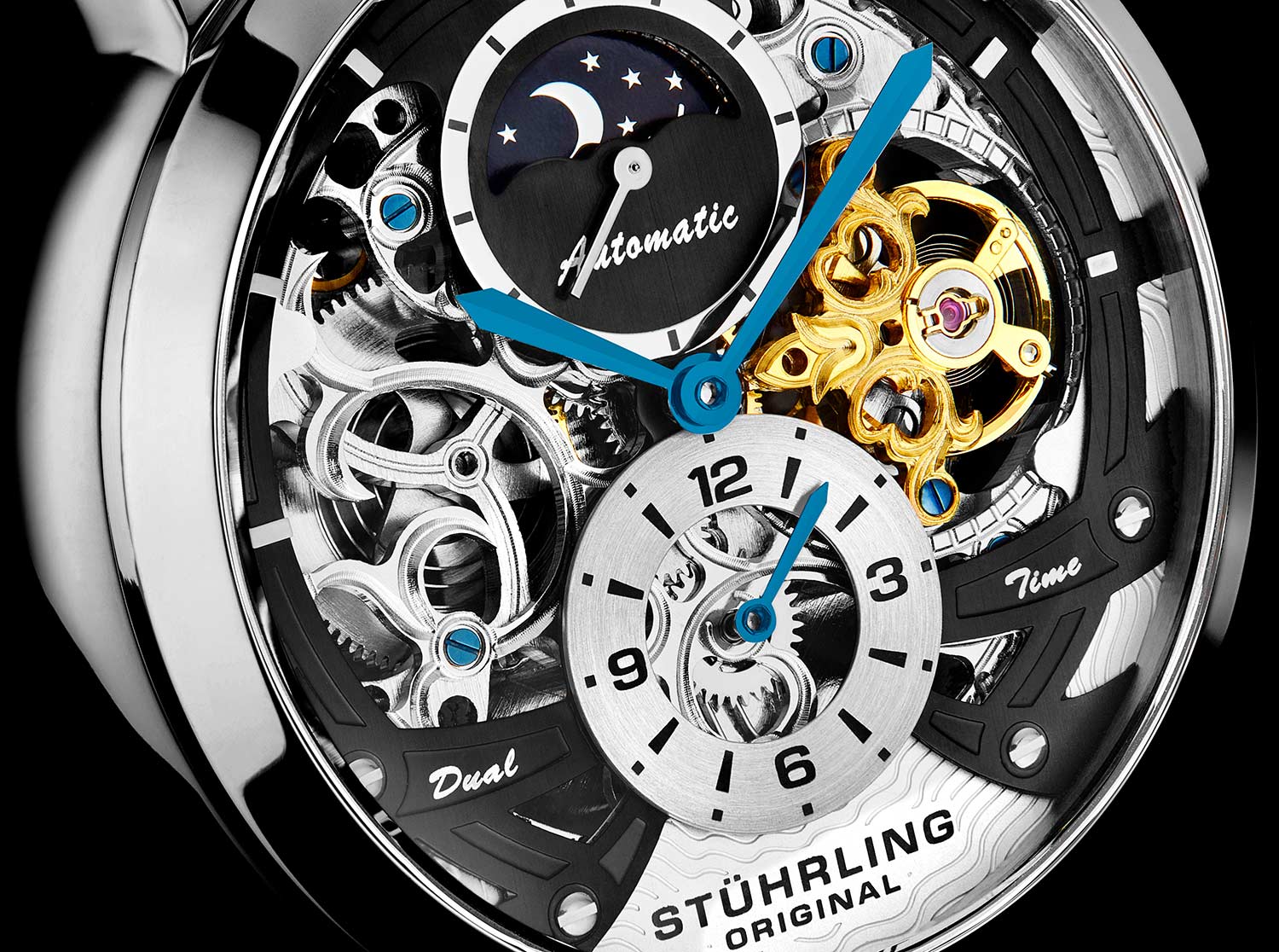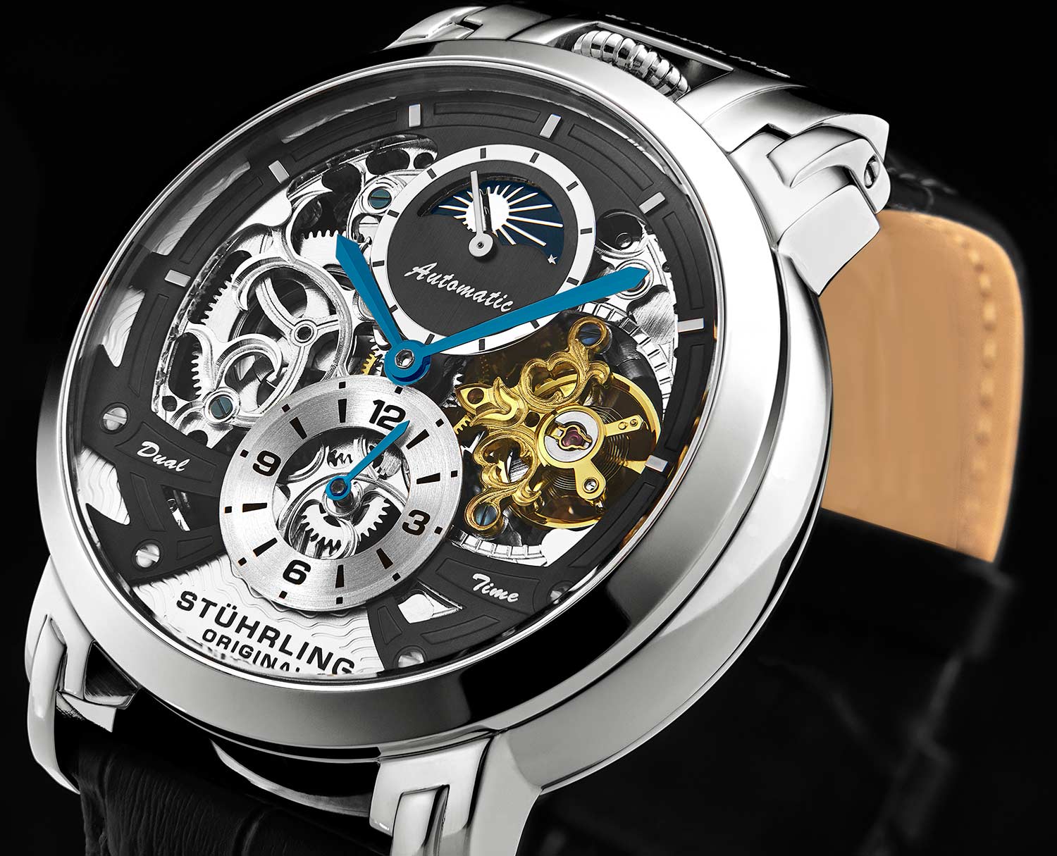 Насладитесь отточенной работой механизма с этими элегантными мужскими часами. Menai. Скелетонизированные часы. В механизме 22 камня. Второй часовой пояс. Индикатор день/ночь. Накладные метки в виде штрихов и точек. Прозрачная задняя крышка со стеклом Krysterna крепится на 4-х винтах. Заводная головка с защитой находится в положении 12 часов. Ремешок с классической застежкой.