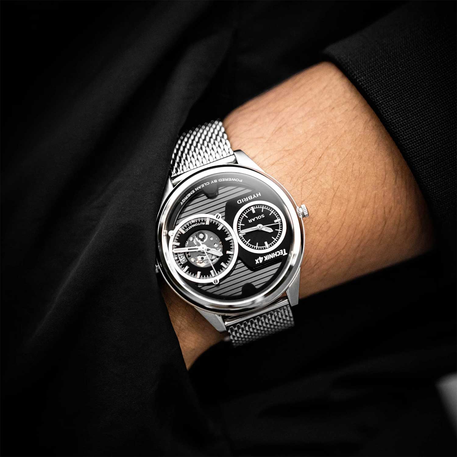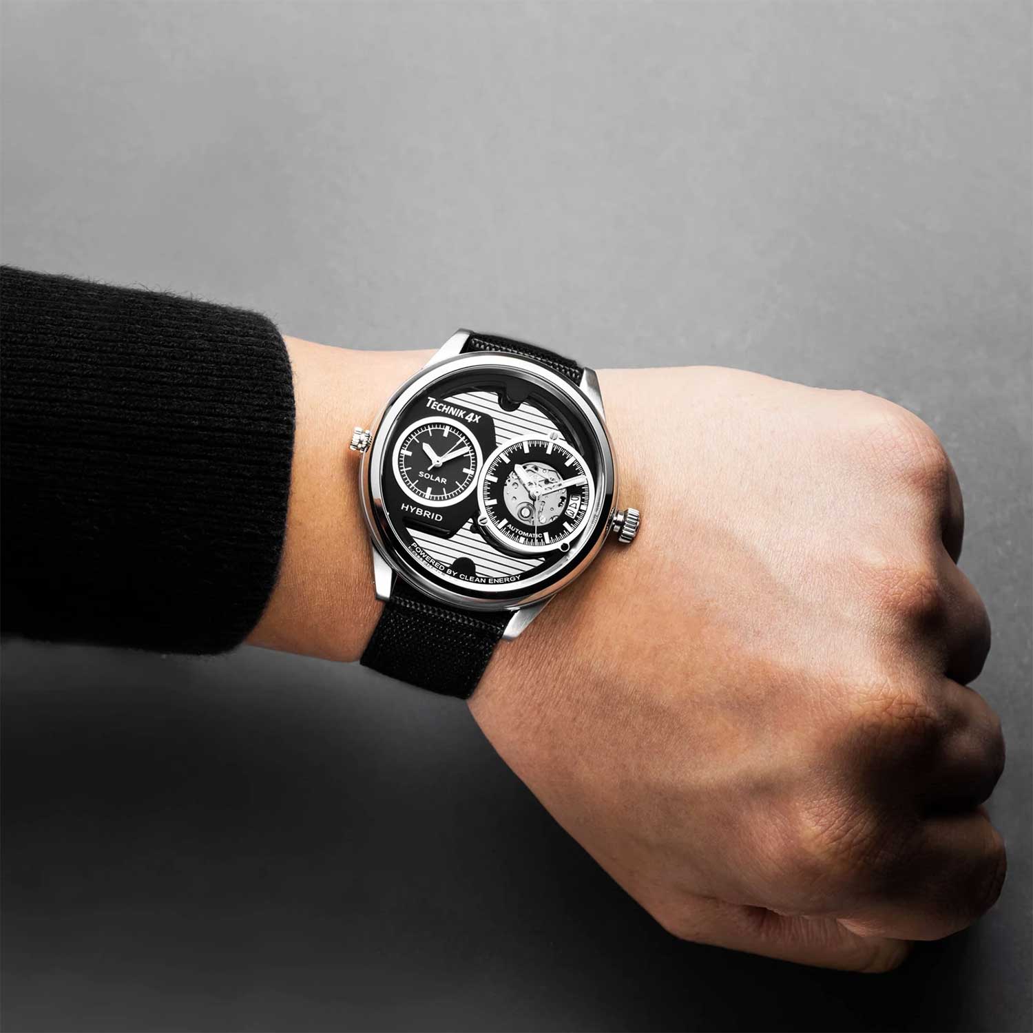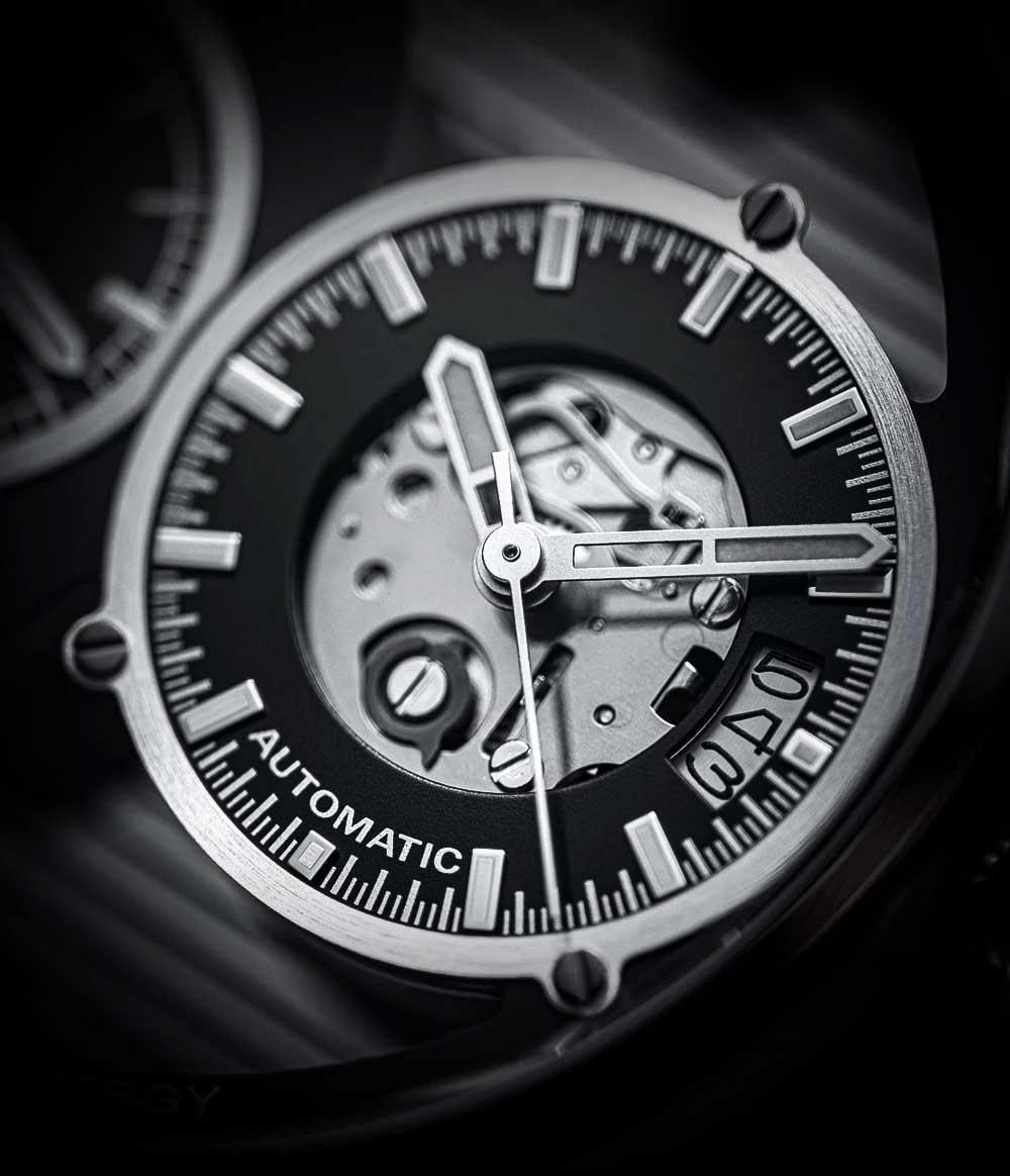 Два часовых пояса делают из этого аксессуара идеального компаньона в любом путешествии. Скелетонизированные часы Skeletor Pro, изготовленные из переработанных материалов. Два японских механизма находятся на стальном держателе, который покрыт родиевым покрытием и украшен узором ''женевские волны''. Второй часовой пояс. В механическом механизме 21 камень, частота 21600 полуколебаний в час. Запас хода 40 часов. Кварцевый механизм питается от солнечной энергии. Время работы аккумулятора без подзарядки приблизительно 6 месяцев. Метки в виде штрихов. 10-ти слойное антибликовое покрытие стекла позволит четко видеть циферблат даже в самый яркий день. Прозрачная задняя крышка с сапфировым стеклом украшена полосами и крепится на 4-х винтах. Браслет миланского плетения с раскладывающейся застежкой и системой быстрой замены. В комплекте сменный нейлоновый ремешок.