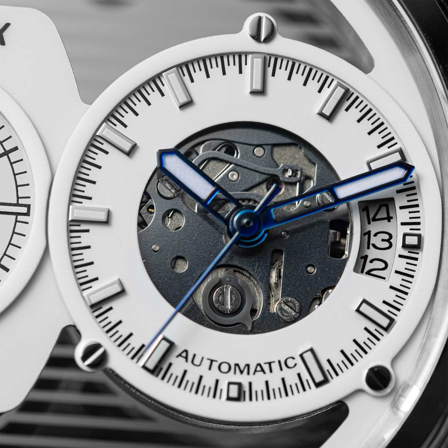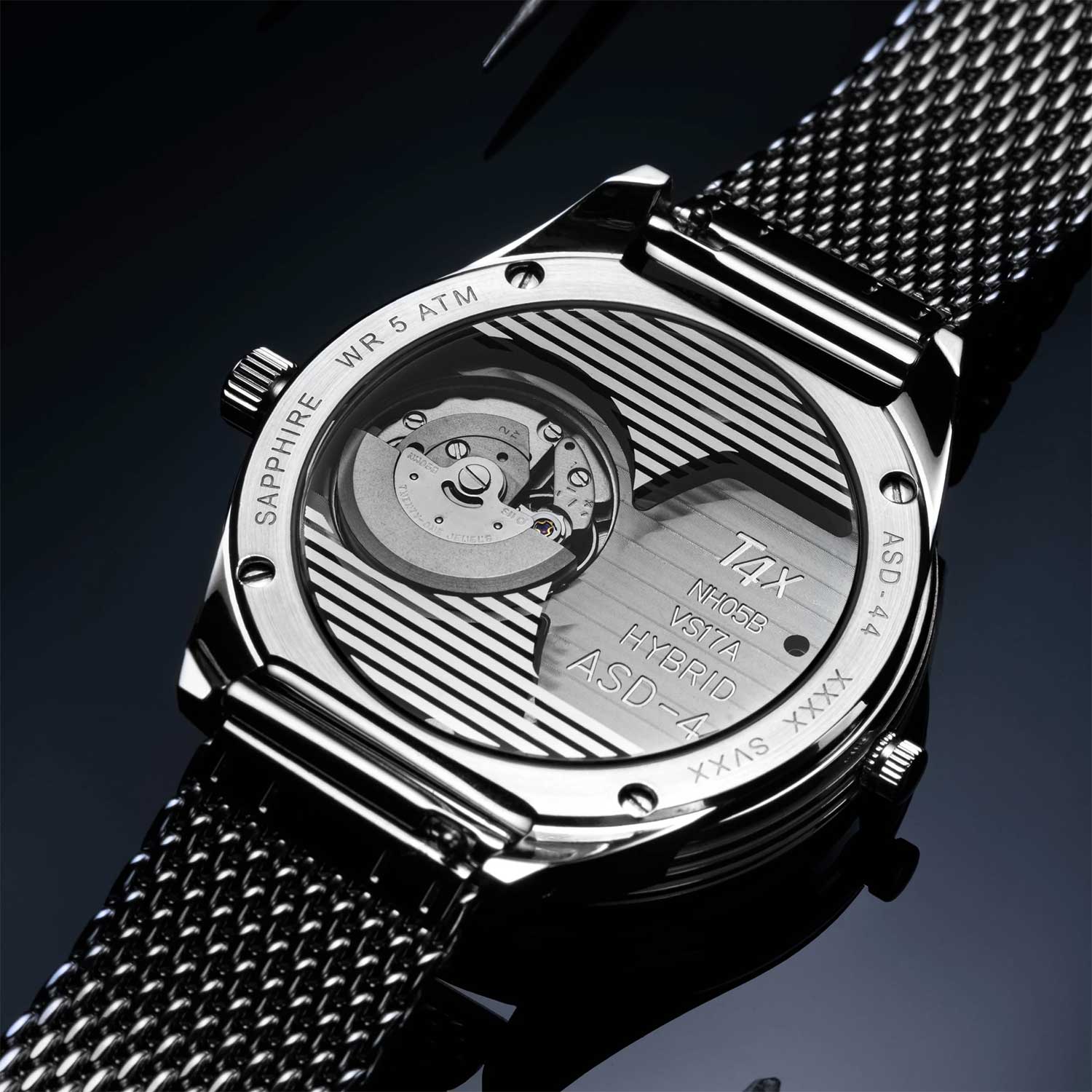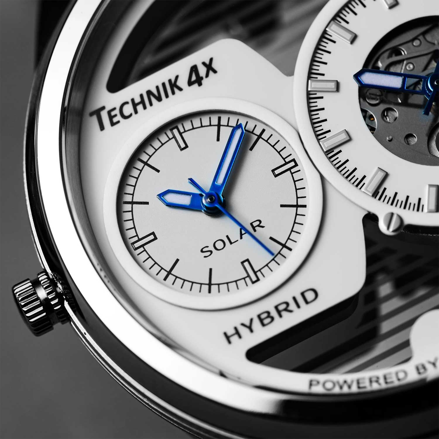 Два часовых пояса делают из этого аксессуара идеального компаньона в любом путешествии. Скелетонизированные часы Skeletor Pro, изготовленные из переработанных материалов. Два японских механизма находятся на стальном держателе, который покрыт родиевым покрытием и украшен узором ''женевские волны''. Второй часовой пояс. В механическом механизме 21 камень, частота 21600 полуколебаний в час. Запас хода 40 часов. Кварцевый механизм питается от солнечной энергии. Время работы аккумулятора без подзарядки приблизительно 6 месяцев. Метки в виде штрихов. 10-ти слойное антибликовое покрытие стекла позволит четко видеть циферблат даже в самый яркий день. Прозрачная задняя крышка с сапфировым стеклом украшена полосами и крепится на 4-х винтах. Браслет миланского плетения с раскладывающейся застежкой и системой быстрой замены. В комплекте сменный нейлоновый ремешок.
