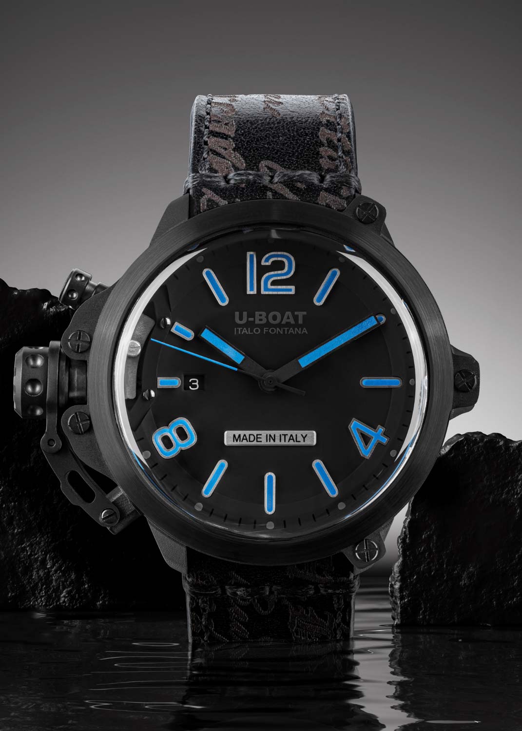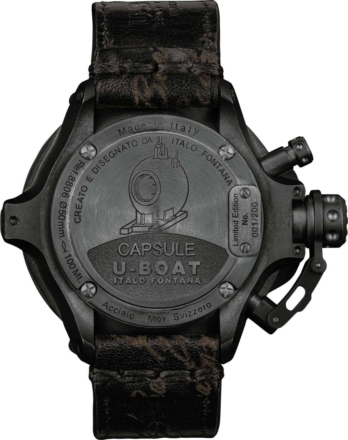 Capsule. Мужские наручные часы. Лимитированная серия — 200 экземпляров. Задуманный в форме батискафа корпус декорирован винтами. В механизме 26 камней, частота 28800 полуколебаний в час. Запас хода 41 час. Циферблат с метками в виде штрихов, арабских цифр 4, 8 и 12. Окошко даты находится на отметке 9 часов. Стрелки и метки с люминесцентным покрытием SuperLuminova, которое светится в темноте после непродолжительной зарядки на свету.