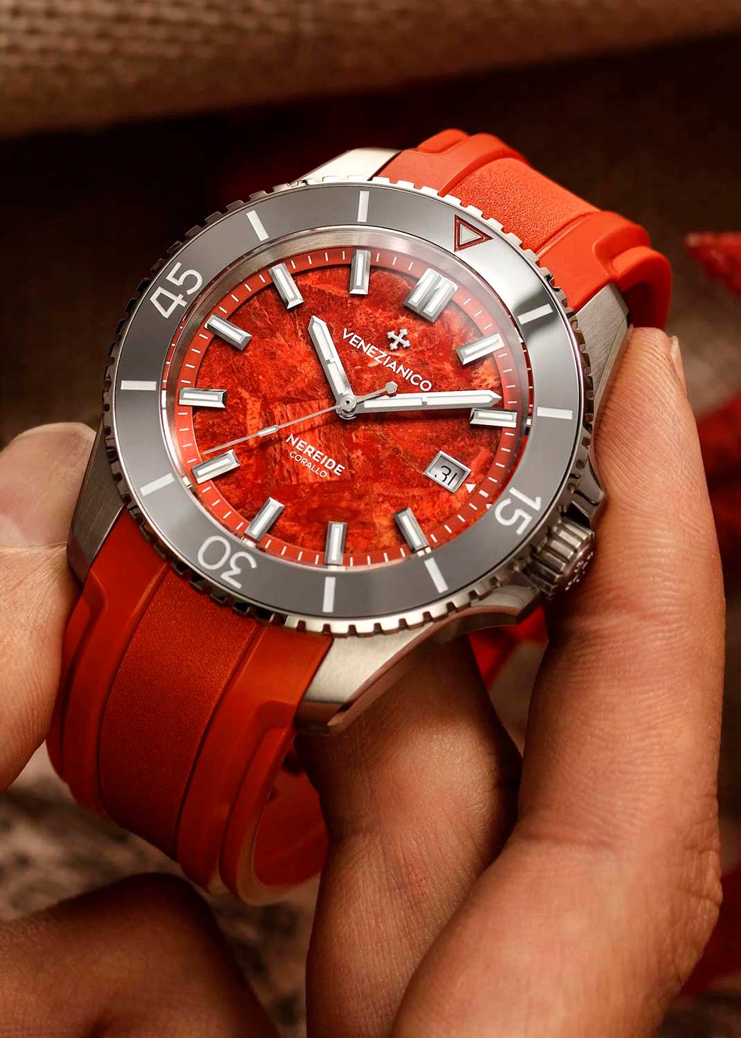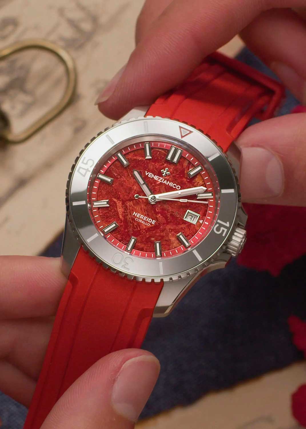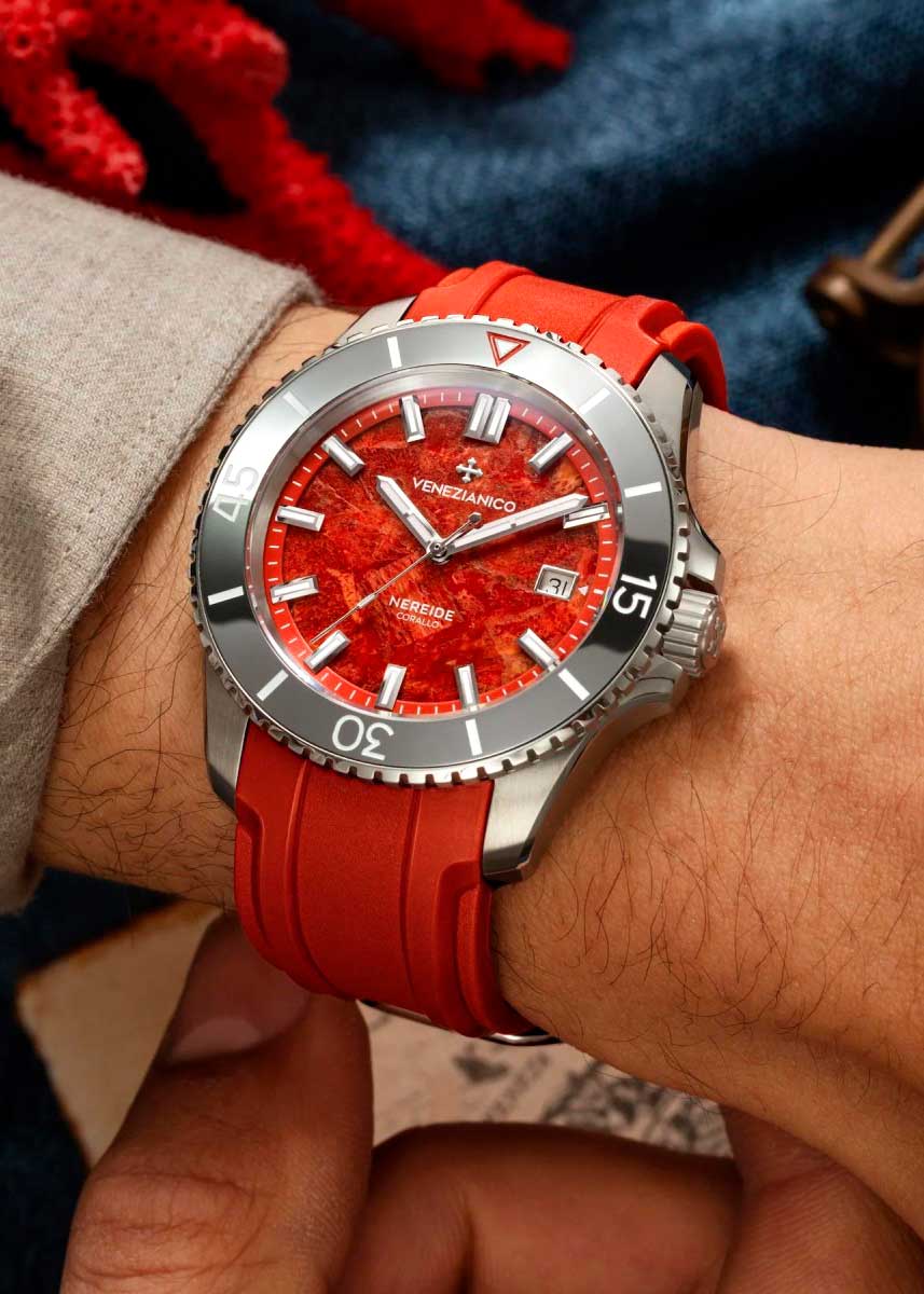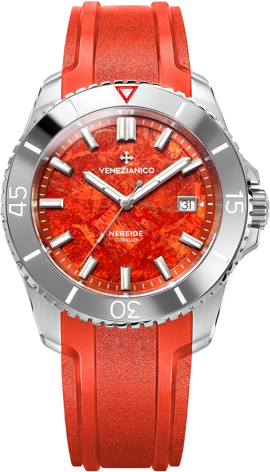 Итальянские мужские наручные часы с автоподзаводом Nereide Corallo. В механизме 26 камней, частота 28800 полуколебаний в час. Запас хода 38 часов. Круглый стальной корпус с сатинированной и полированной отделкой. Рифленый безель с вольфрамовой вставкой, прочной и устойчивой к царапинам, рассчитан на 120 щелчков. Циферблат выполнен в мозаичной технике из мадрепоровых кораллов. Накладные метки в виде штрихов. Заостренные прямоугольные стрелки в стиле Baton.