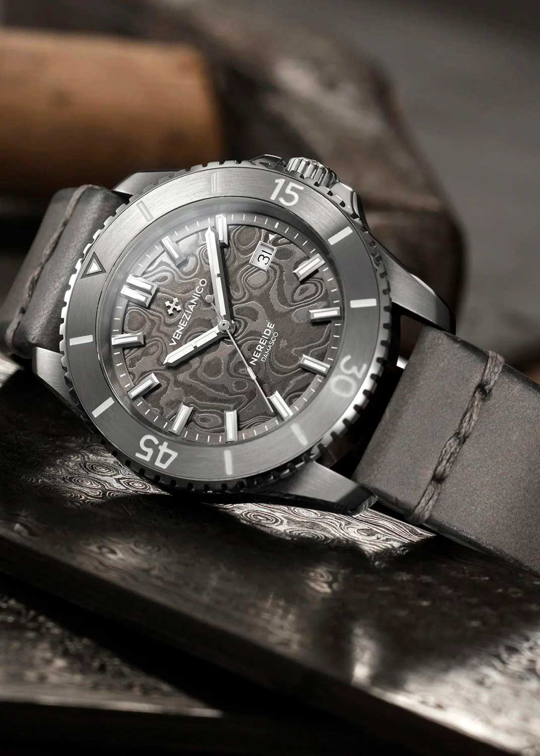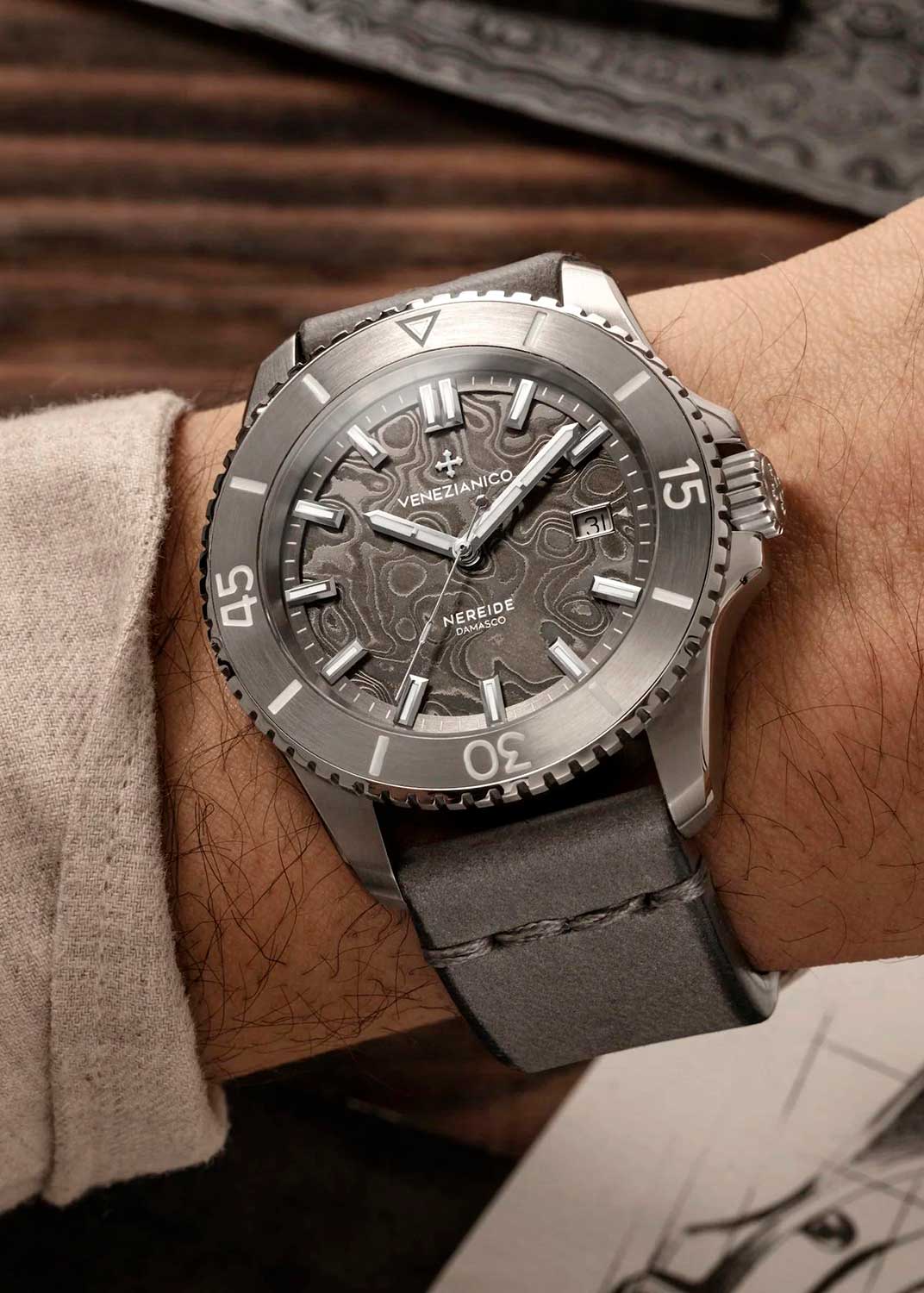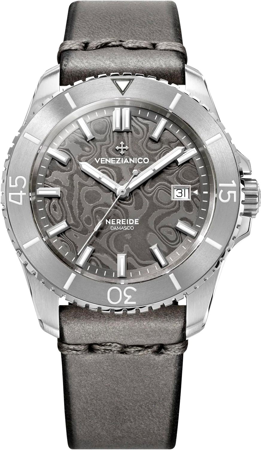 Итальянские мужские наручные часы с автоподзаводом Nereide Damasco. В механизме 26 камней, частота 28800 полуколебаний в час. Запас хода 38 часов. Круглый стальной корпус с сатинированной и полированной отделкой. Рифленый безель с вольфрамовой вставкой, прочной и устойчивой к царапинам, рассчитан на 120 щелчков.