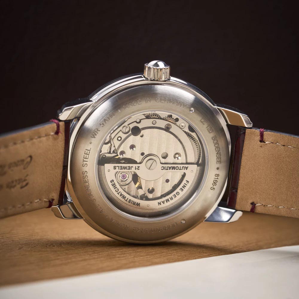 Гармоничная стильная модель с автоматическим механизмом и с круглым корпусом на кожаном ремешке, для смелых и решительных. Мужские механические часы в круглом стальным корпусе LZ 120 Bodensee. В механизме 21 камень. Метки в виде штрихов. Сквозь окошко на циферблате можно наблюдать за работой механизма. Секундная стрелка вынесена на малый циферблат. Рифленая заводная головка. Ремешок из натуральной кожи с классической застежкой.