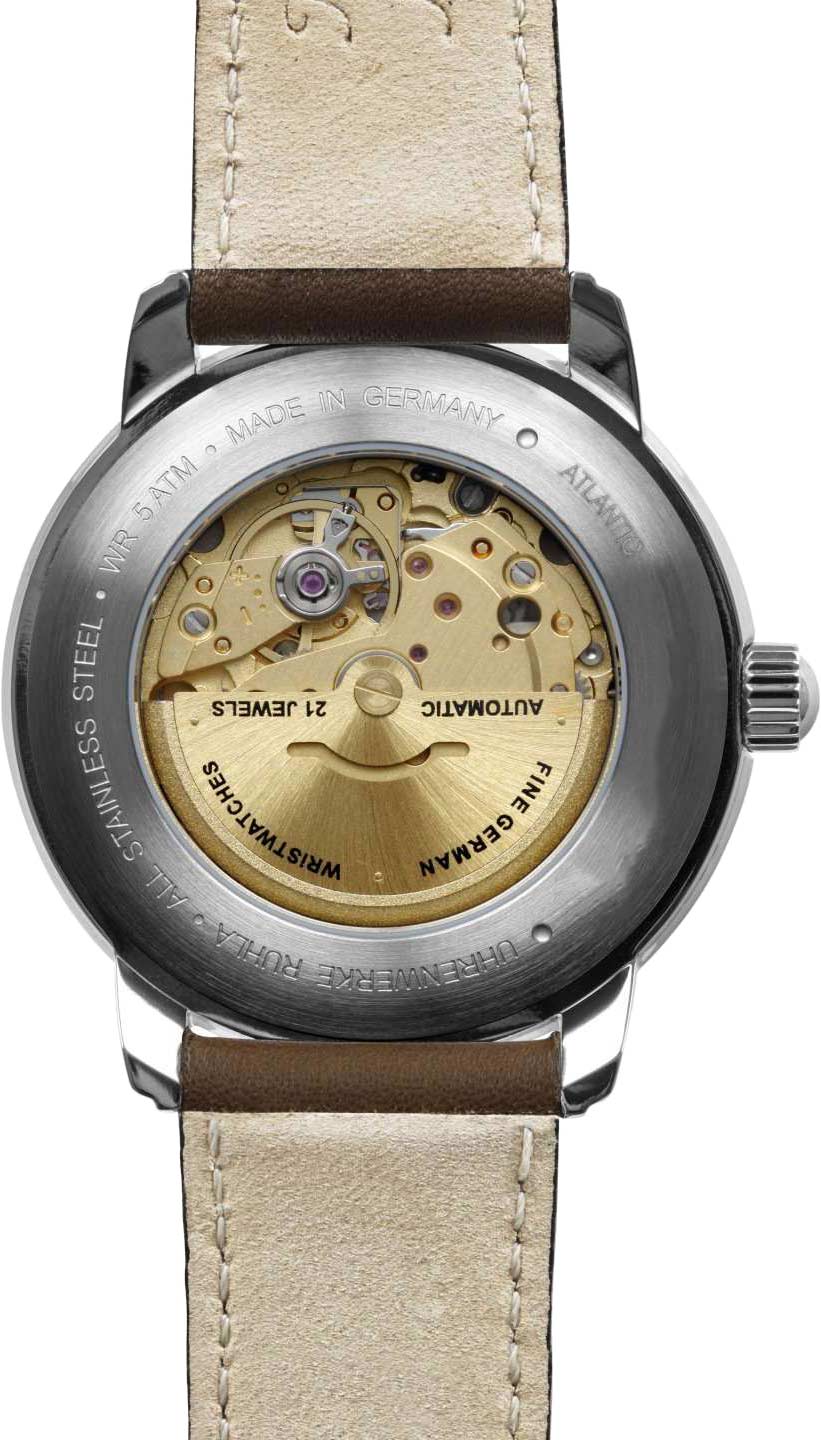 Мужские наручные часы. В механизме 21 камень. Круглый стальной корпус. Циферблат с метками в виде штрихов. Окошко даты и дня недели находится в положении 3 часа. Клиновидные стрелки в стиле Dauphine с люминесцентным покрытием, которое светится в темноте после непродолжительной зарядки на свету. Рифленая заводная головка. Прозрачная задняя крышка. Удобный кожаный ремешок с классической застежкой.