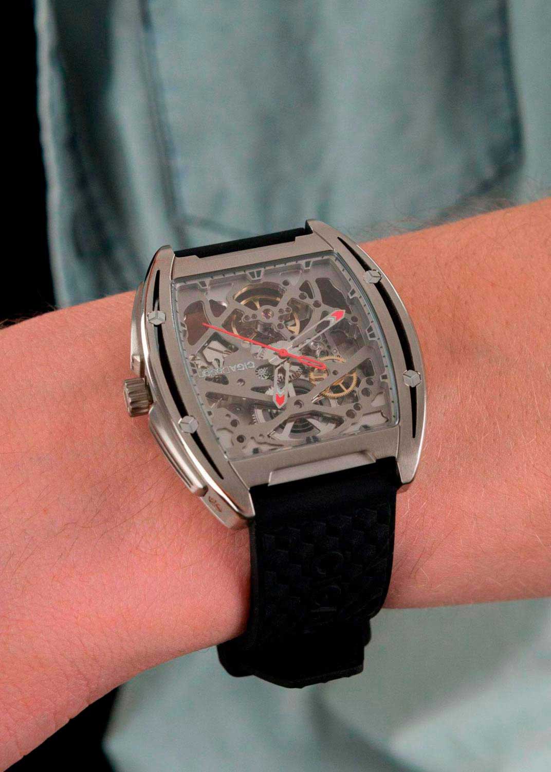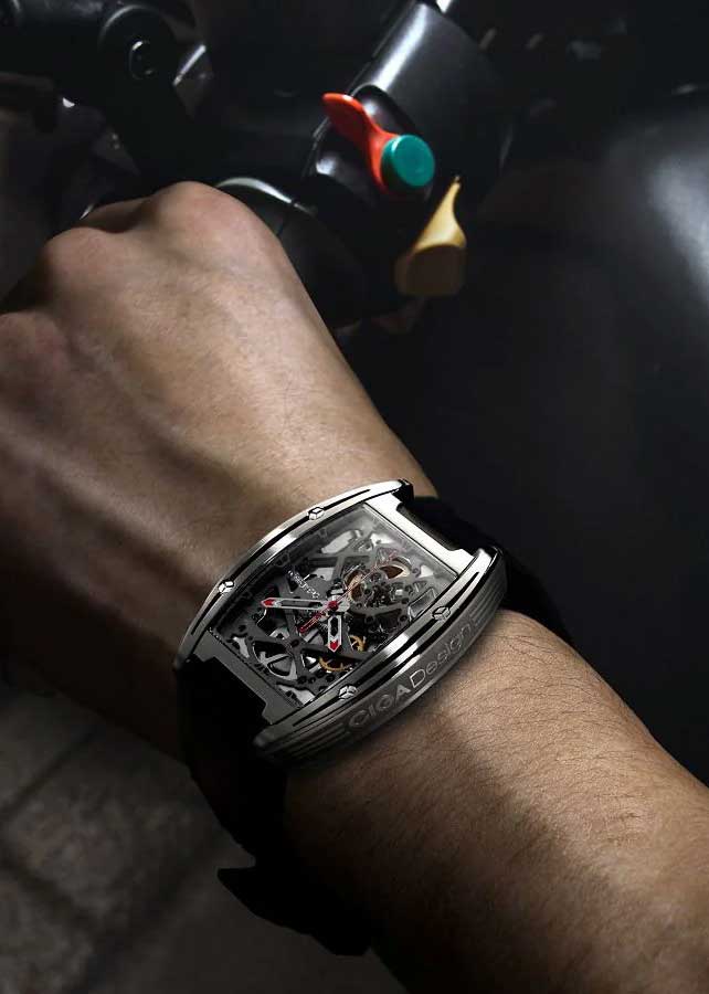 Скелетонизированные часы Z-Series. Титановый корпус особой бочкообразной формы. Оригинальные шестигранные винты маскируют прочный крепеж. В механизме 25 камней, частота 21600 полуколебаний в час. Запас хода 40 часов. С вращением шестеренок можно видеть каждую секунду и ощутить единство механики со временем.
