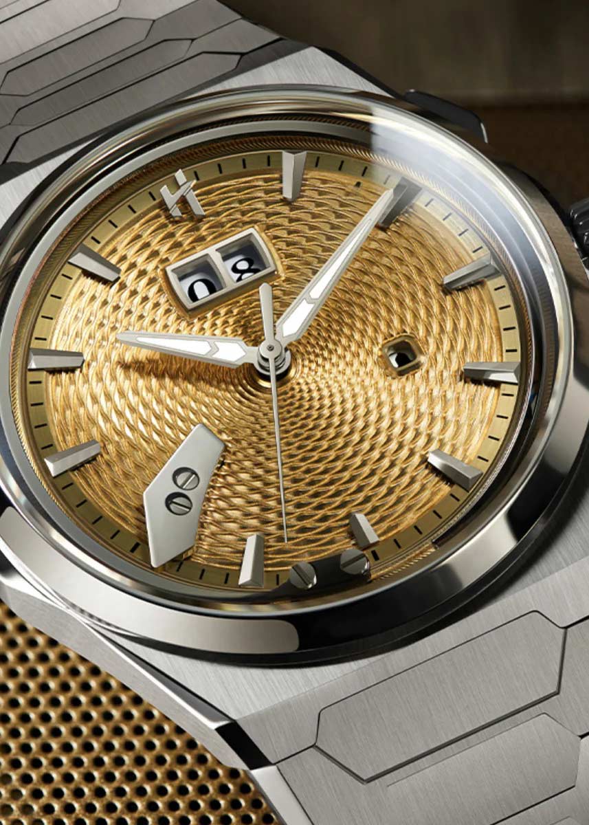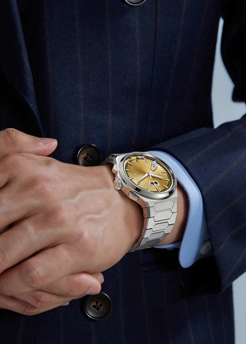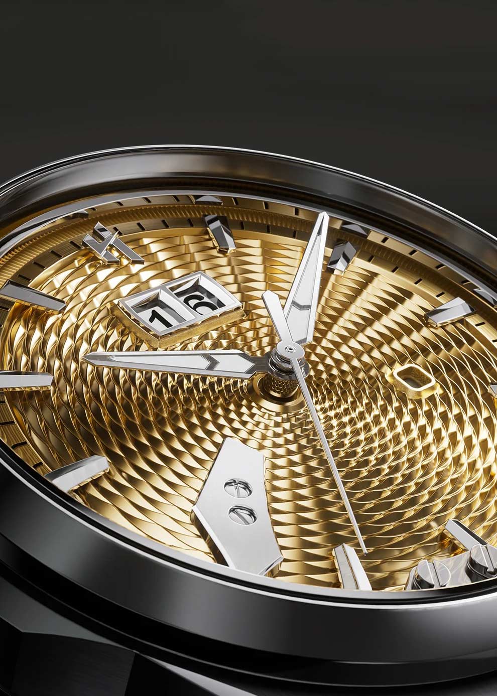 Гильошированный циферблат «колос пшеницы» с метками в виде штрихов. Стрелки с люминесцентным покрытием, которое светится в темноте после непродолжительной зарядки на свету. Окошко даты находится в положении 12 часов. Рифленая заводная головка украшена фирменным логотипом. Прозрачная задняя крышка крепится на 4-х винтах. Титановый браслет с раскладывающейся застежкой и системой быстрой замены.