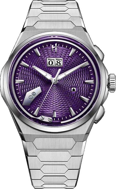 Гильошированный циферблат «колос пшеницы» с метками в виде штрихов. Стрелки с люминесцентным покрытием, которое светится в темноте после непродолжительной зарядки на свету. Окошко даты находится в положении 12 часов. Рифленая заводная головка украшена фирменным логотипом. Прозрачная задняя крышка крепится на 4-х винтах. Титановый браслет с раскладывающейся застежкой и системой быстрой замены.