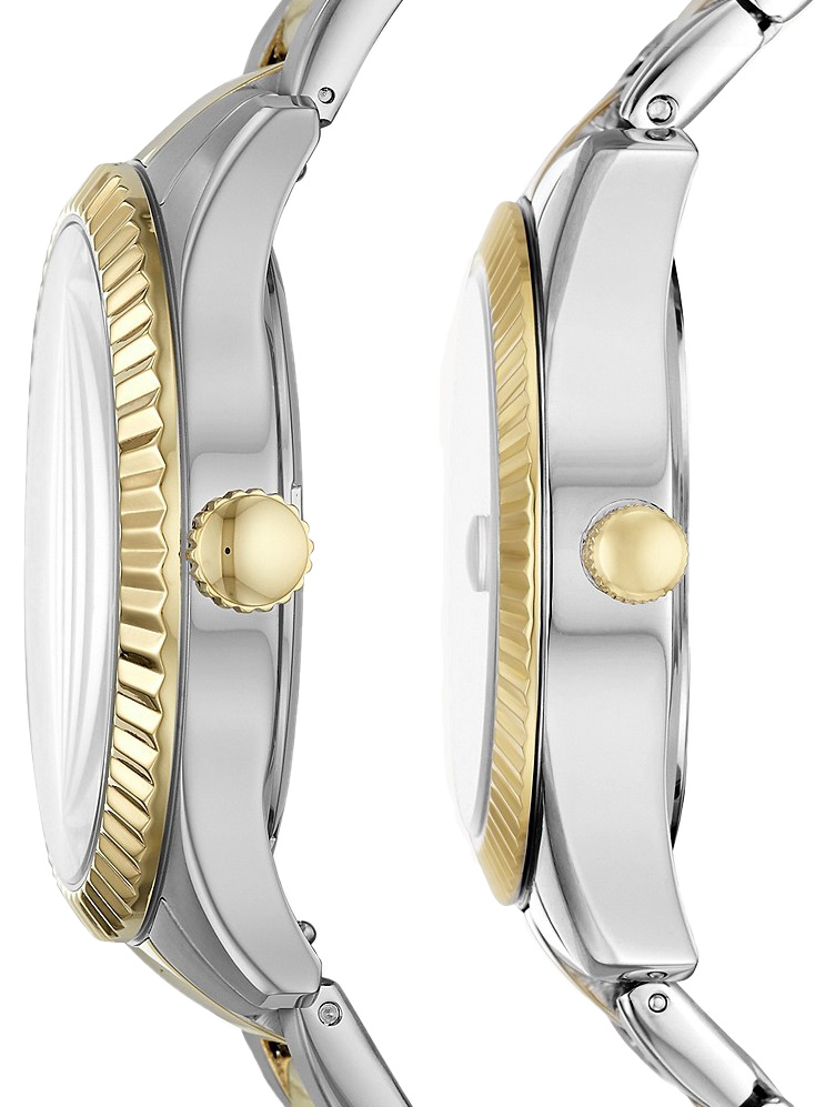 Идеальный вариант для влюбленных - парный комплект часов! Сет из мужских и женских часов с круглым корпусом. На мужской модели 12-ти и 24-х часовой формат времени. Число и день недели отображаются на отдельных циферблатах. На женской модели окошко даты находится в положении 3 часов. Метки в виде штрихов и римских цифр. Рифленая заводная головка. Браслет с раскладывающейся застежкой.