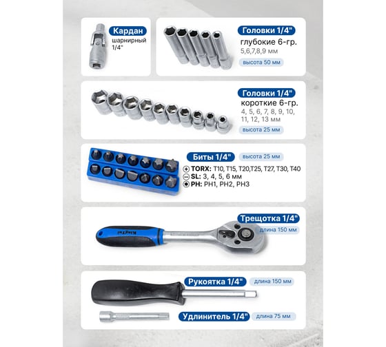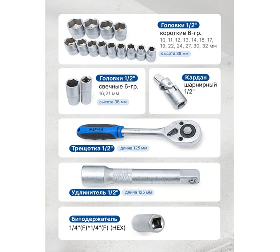 - Посадочный размер трещотки1/4; 1/2 дюйма