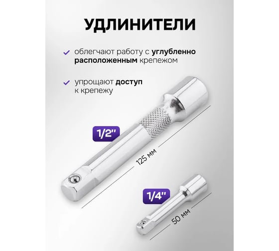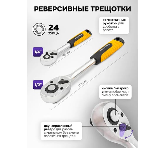 - Посадочный размер трещотки1/4; 1/2 дюйма