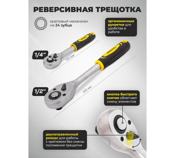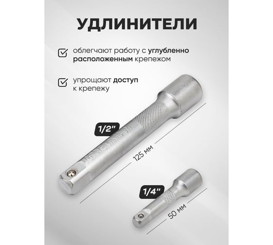 - Посадочный размер трещотки1/4; 1/2 дюйма