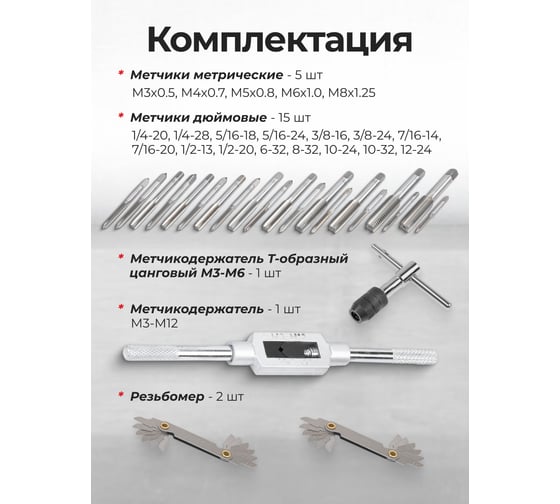 - Комплектацияметчики, плашки, вороток, плашкодержатель, резьбомер