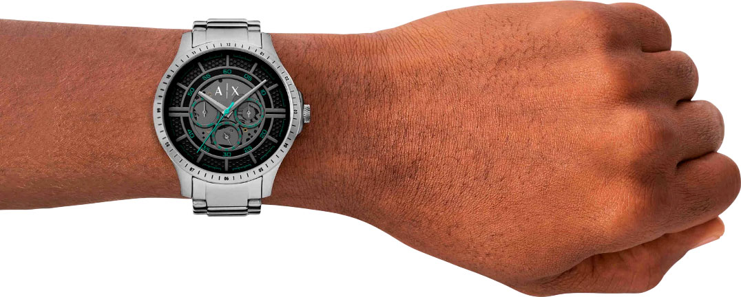 Мужские кварцевые часы Hampton. 12-ти и 24-х часовой формат времени. Число, день недели и 24-часовая шкала вынесены на отдельные циферблаты. Метки в виде штрихов. Рифленая заводная головка. Стальной браслет с раскладывающейся застежкой.