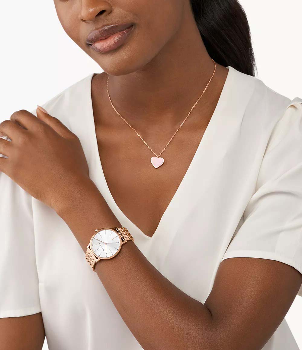 Ультратонкие женские часы. Круглый стальной корпус. Циферблат выполнен по технологии Sunray (солнечные лучи) и украшен кристаллами. Метки в виде штрихов. Браслет с раскладывающейся застежкой. В комплекте подвеска в форме сердца на цепочке.