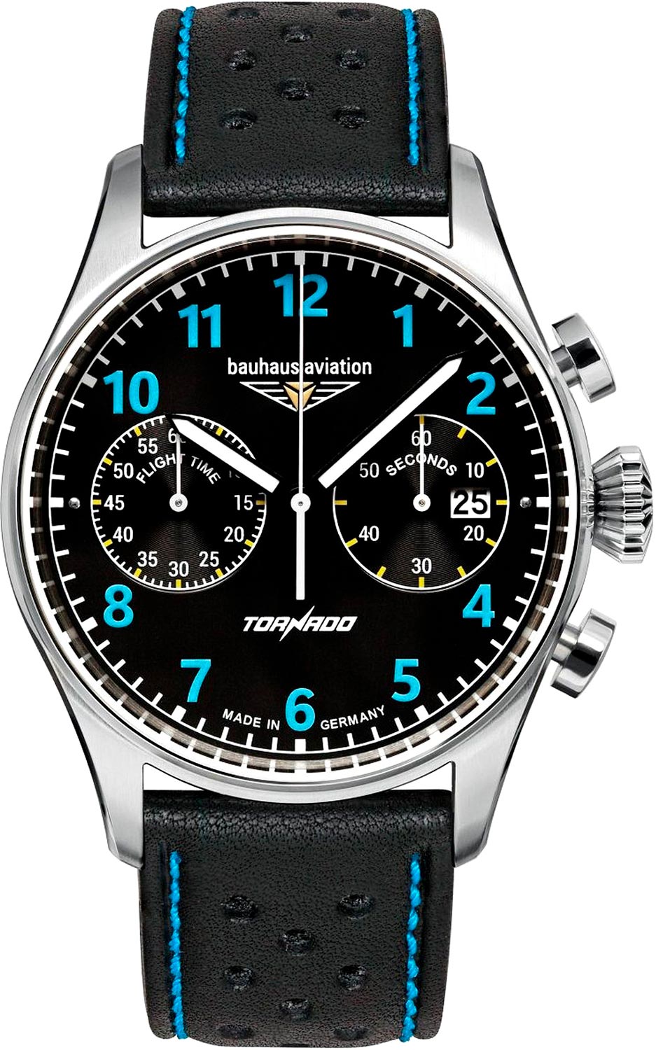 Функциональные мужские наручные часы-хронограф с секундомером Aviation Tornado. Круглый стальной корпус c матовой и полированной отделкой. Матовый циферблат. Метки в виде арабских цифр. Окошко даты находится в положении 3 часа. Заостренные прямоугольные стрелки в стиле Baton.