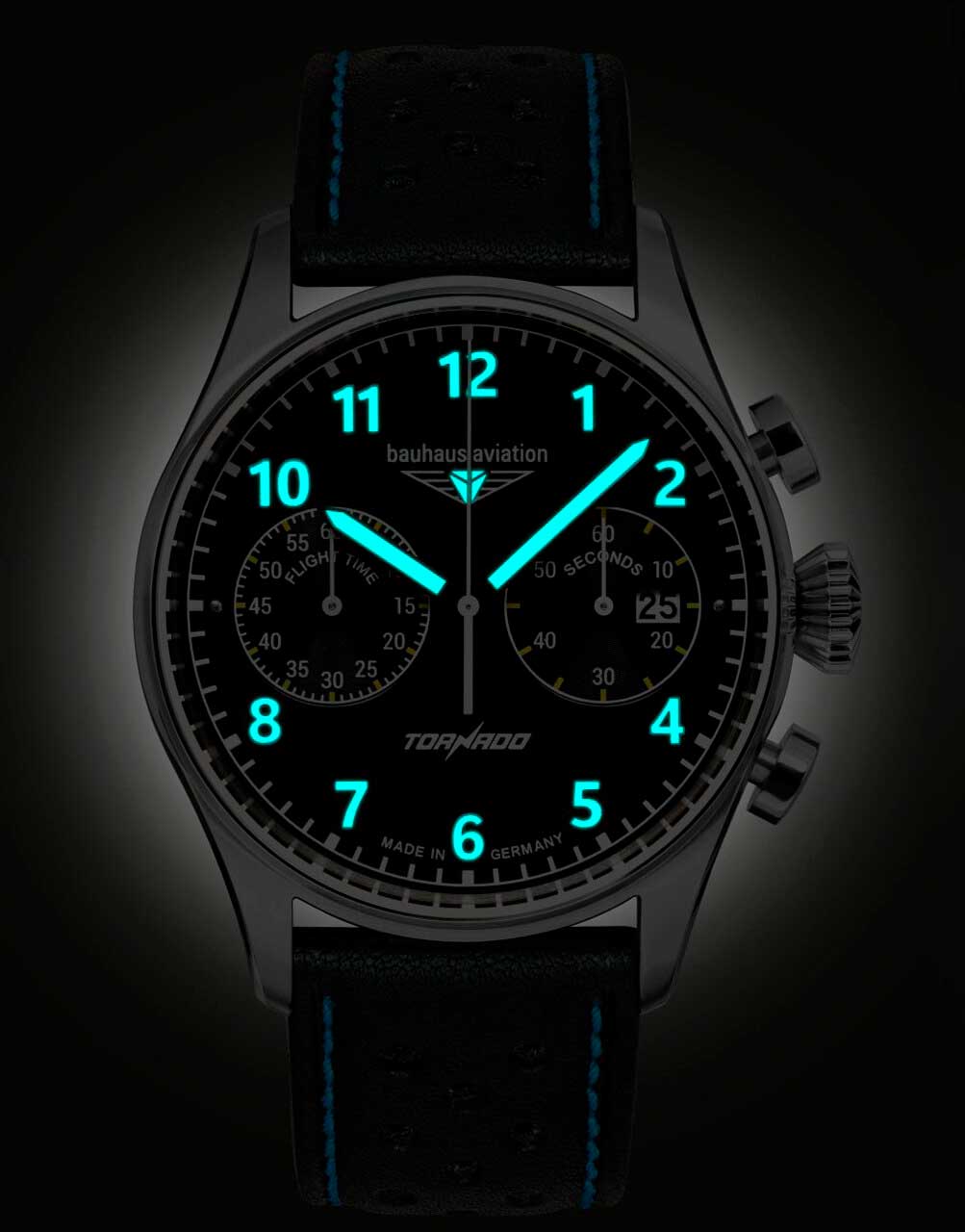 Метки и стрелки с люминесцентным покрытием, которое светится в темноте после непродолжительной зарядки на свету. Рифленая, в форме конуса, заводная головка с фирменным логотипом. Удобный перфорированный кожаный ремешок с декоративной голубой строчкой.