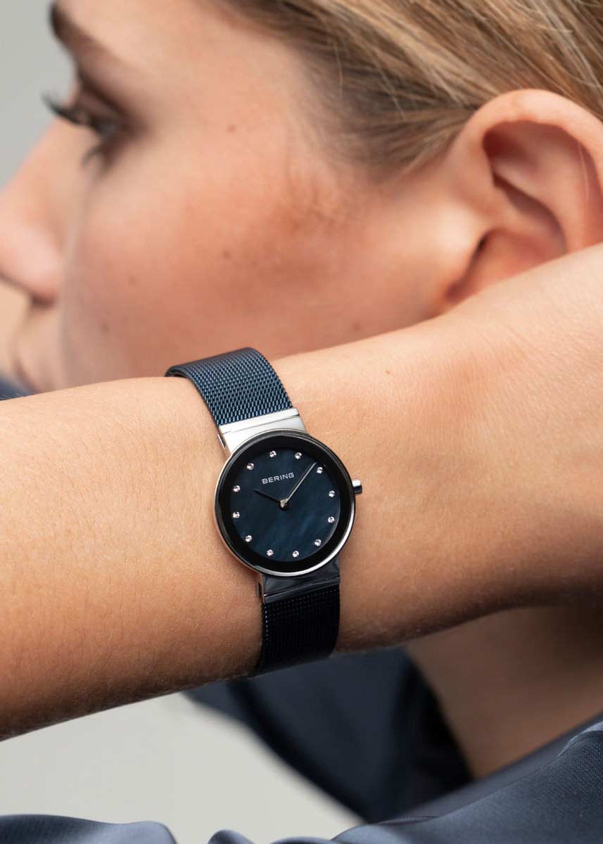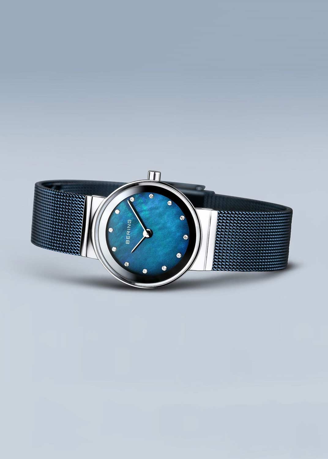 Ультратонкие женские наручные часы. Круглый стальной корпус. Перламутровый циферблат защищен прочным сапфировым стеклом. Метки в виде точек с кристаллами Swarovski. Гладкая заводная головка. Стальной браслет миланского плетения. Застежка с фиксатором.