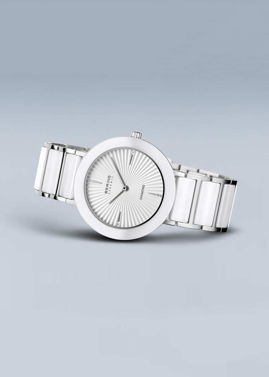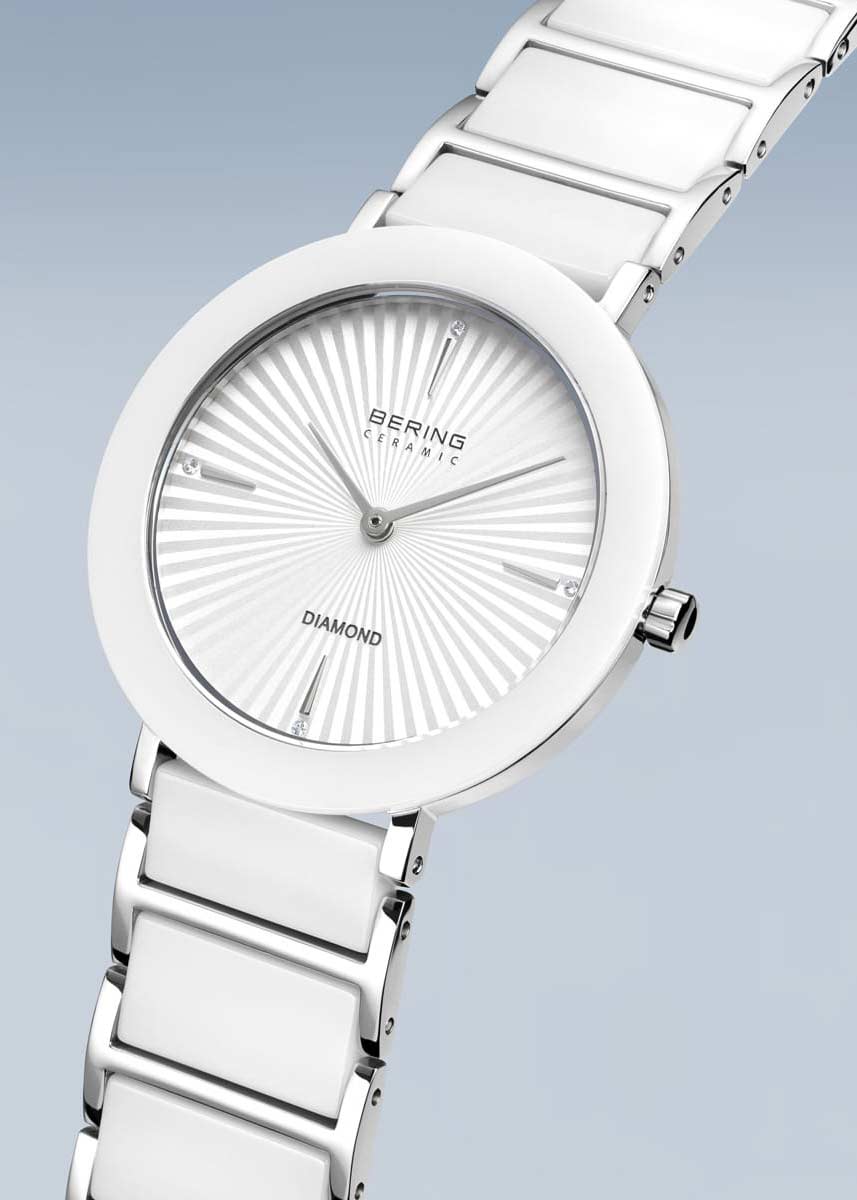 Метки в виде штрихов и точек с кристаллами. Рифленая заводная головка. Стальной браслет с керамическими звеньями. Раскладывающаяся застежка.