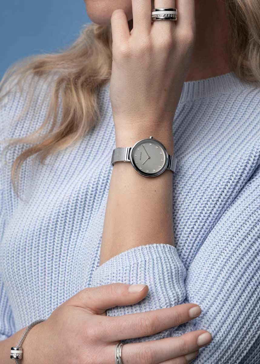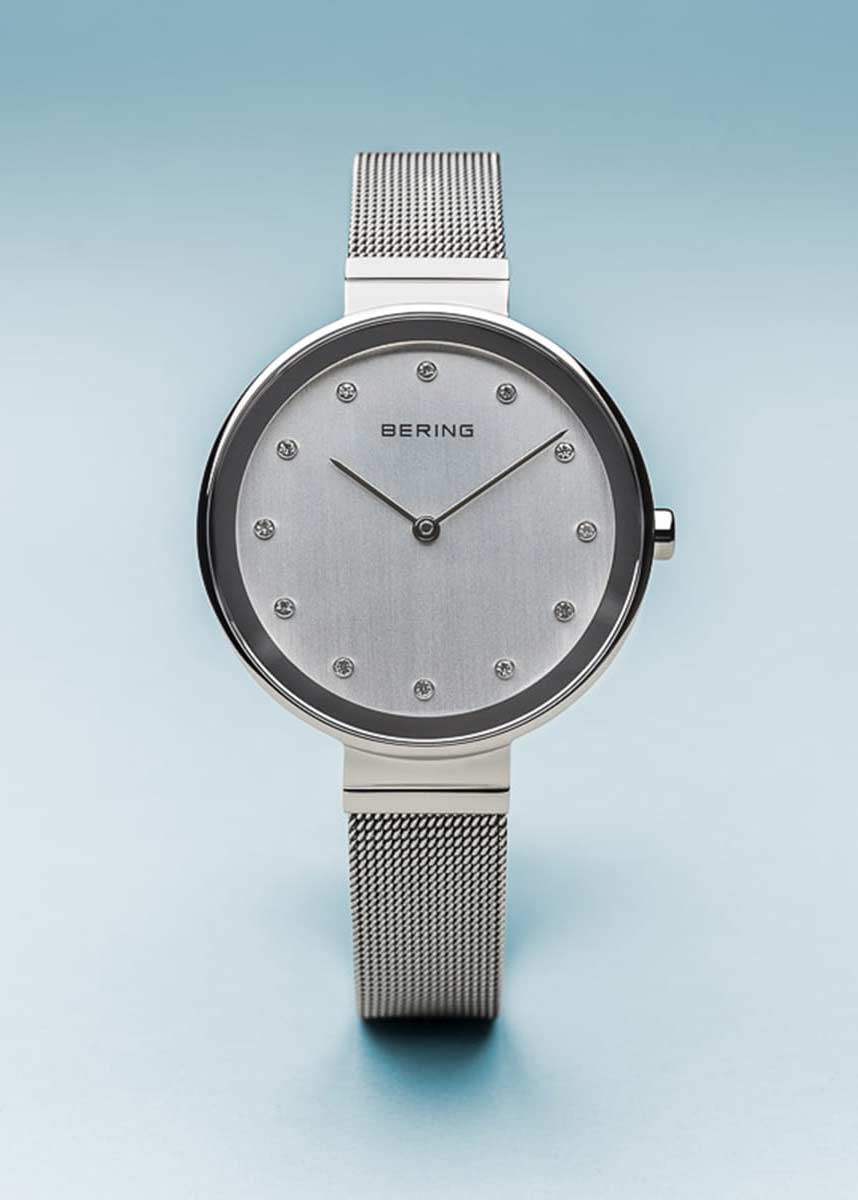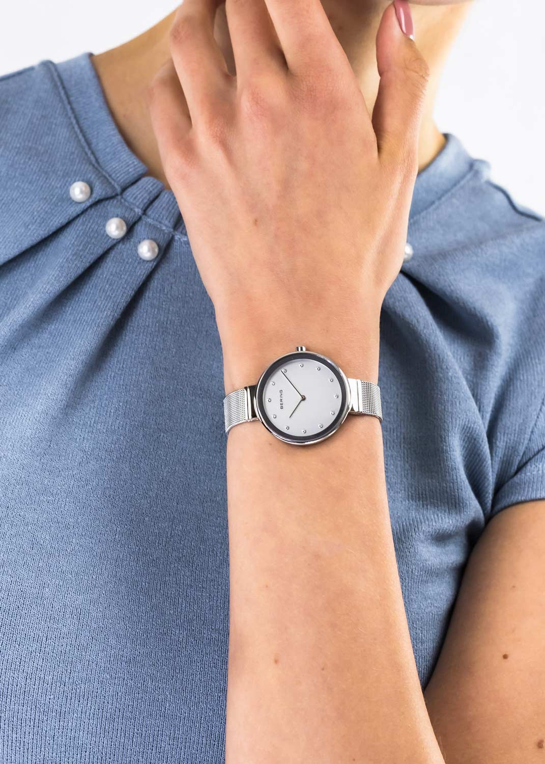 Ультратонкие женские наручные часы. Круглый стальной корпус. Циферблат защищен прочным сапфировым стеклом. Метки в виде точек с кристаллами Swarovski. Гладкая заводная головка. Стальной браслет миланского плетения. Застежка с фиксатором.