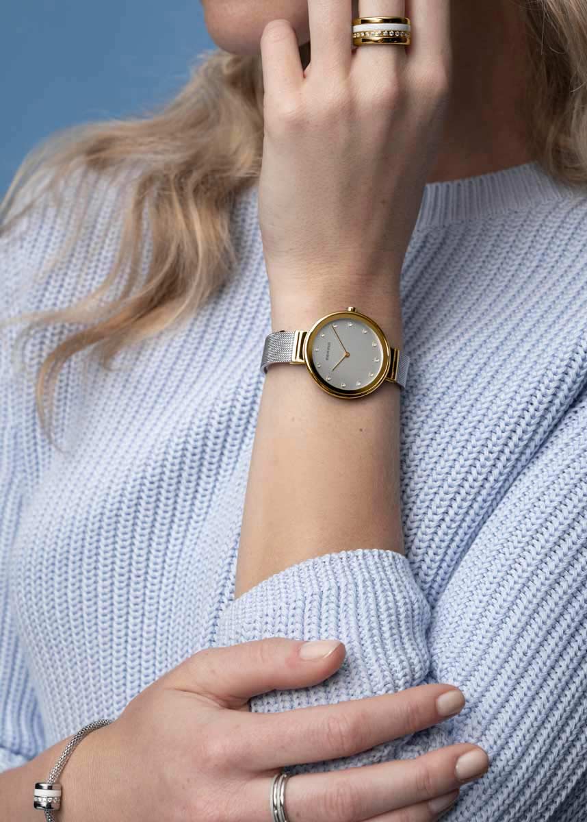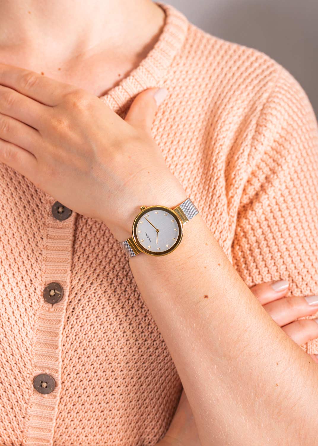 Ультратонкие женские наручные часы. Круглый стальной корпус. Циферблат защищен прочным сапфировым стеклом. Метки в виде точек с кристаллами Swarovski. Гладкая заводная головка. Стальной браслет миланского плетения. Застежка с фиксатором.